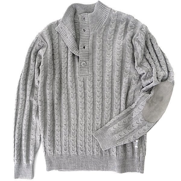 【Sheltie Club】 〈湘南の海〉をテーマとしたブランドコンセプトに沿って、マリンテイストを味付けしたシンプルなスタイルを信条とし、ラフで、気取らず、気張らない、ややゆったりとした着こなしを提案します。 程よく厚手で暖かみがあるニット素材のスタンドネックプルオーバーです。 しっかりとした肉感で肌心地が良い風合いのウールブレンドニット素材を使用しており、自宅で気軽に洗えるウォッシャブル仕様のため、クリーニングを気にせずにデイリーに着用ができるのも嬉しいポイントです。 ケーブル編みデザインに、首元まで覆えるスタンドネック仕様で暖かな着心地。 胴体脇に骨をモチーフとしたビスや、フェイクスエードでのエルボーパッチがデザインアクセントになっております。 |