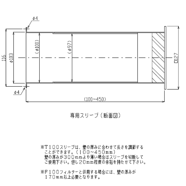 【サーモフレッシュV100用の専用スリーブT100と 専用フィルターF100のセット】・T100スリーブは、壁の厚みに合わせて長さを調節できます。