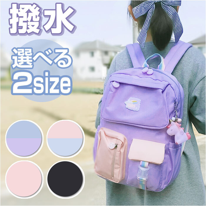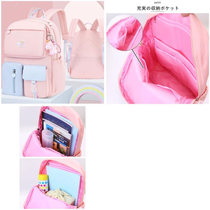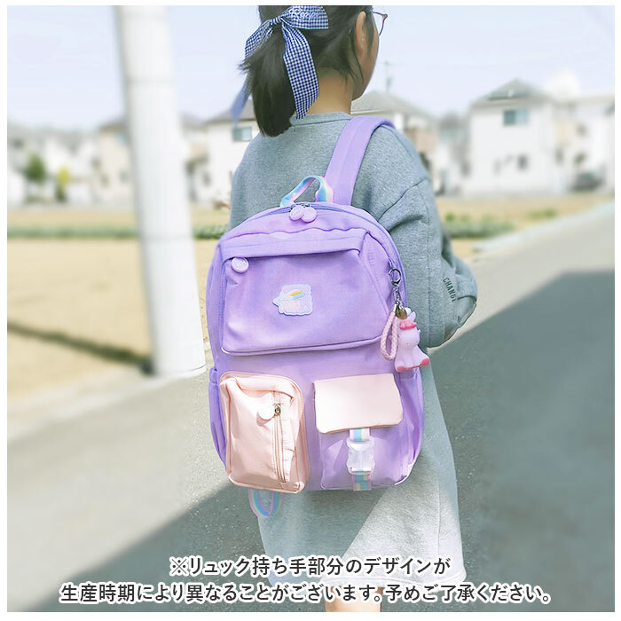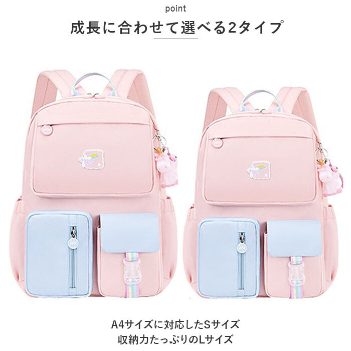 | 商品説明 | ・・女の子の憧れをいっぱい詰め込んで、オシャレにお出掛け♪パステルカラーが可愛い「キッズリュックサック」が新登場。 ・【学習グッズの準備が楽ちん】 ・メインルーム開口部は左右どちらからも開けやすいダブルファスナーを採用。側面まで大きく開いて、教科書や文房具の出し入れがスムーズ。 ・【成長に合わせて選べる2タイプ】 ・リュックのサイズは、スモールサイズ(S)とラージサイズ(L)の2種類からチョイス可能。A4サイズに対応したSサイズは低学年の女の子に。高学年のお姉さんになったら、さらに収納力たっぷりのLサイズがオススメ! ・【通学にぴったりのサイズ感】 ・程よいマチ幅のあるメインルームには、教科書やノートはもちろん、ランチボックスもすっぽり入って遠足やピクニックでも大活躍。 ・【充実の収納ポケット】 ・メインルーム内側には小物の整理に役立つファスナーポケットが1つに、オープンポケットも4ヶ所配置。背面側には、タブレットの持ち運び時に安心なクッション付きポケットも搭載。 ・【小物にクイックアクセス】 ・バッグ前面のファスナーポケットからは、パスケースやマスクポーチなど出番の多い小物がサッと取り出せて便利。 ・【キッズ携帯の定位置に】 ・レインボーカラーのバックルベルトが印象的なフラップポケットは、キッズ携帯の収納にオススメ。 ・【ボトル&アンブレラポケット】 ・外側両サイドには、水筒や折りたたみ傘をちょこんと挿して持ち運べるオープンポケットが2つ。 ・【貴重品の携帯時も安心】 ・リュックの背面にはお家の鍵をしまったキーケースなど貴重品が安心して収納できるシークレットポケット付き。 ・【キッズの身体に優しい仕様】 ・背中に当たる面やショルダーベルトにはふんわり柔らかいクッションを内蔵し、遠足や旅行で長時間背負うときでも快適。 ・【姉妹でリンクコーデもOK】 ・優しいパステル生地にテープベルトの虹色が映える、女の子の夢をかなえたカラーバリエーション。ユニコーンのソフビマスコットが可愛らしいアクセント。(※ブラックのみベーシックカラーの配色です。) ・【急な雨でも安心】 ・リュックの生地は、汚れや水滴をサッと弾くはっ水加工済みなので、登下校中の急な雨や遠足などのアウトドアでも安心。 ・【ポケット仕様】 ・[メインルーム内部]ファスナーポケット×1、オープンポケット×4 ・クッション付きタブレットポケット×1 ・[リュック前面]ファスナーポケット×2、バックル式フラップポケット×1 ・[外側両サイド]オープンポケット×2 ・[リュック背面]シークレットポケット×2 |