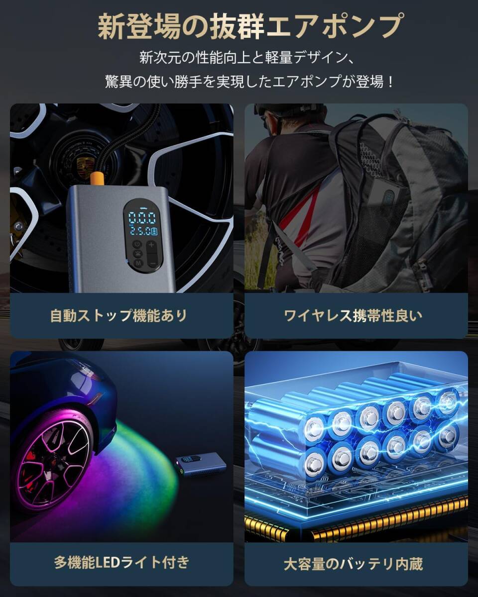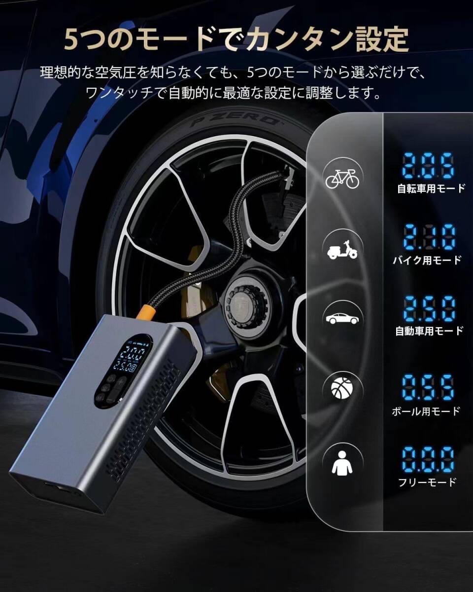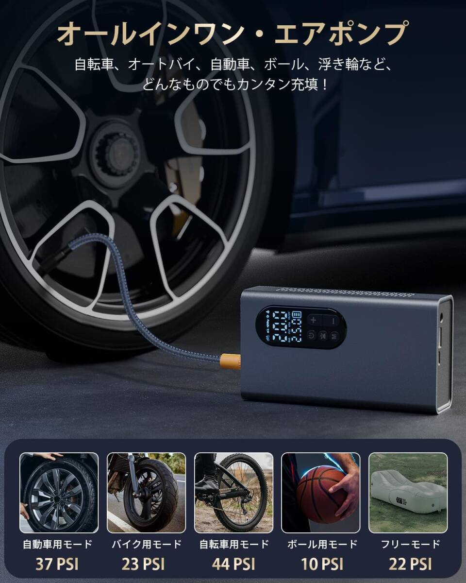 | 【大容量&パワフル】6000mAh大容量バッテリーで、コードレス空気入れは一度充電して12つの自動車用タイヤに充填できます。また、USB出力端子が付いているため、携帯のようなデバイスや小型電気への充電も可能です。白色照明、緊急SOS及びフラッシュの3パターンLEDライトが付いており、夜間作業でも効率よくできます。 【五つの知能モード搭載&急速な熱放散】全種類の自動車、オートバイ、自転車のみならず、全てのボールやエアー玩具にも使えます。空気圧を最大150psi(10.3bar)までセットできるので、各種車タイヤに対応できるだけでなく、効率も大部向上します。コンパクトのエアーポンプ本体の左右両面に排熱穴を搭載しており、長時間使用しても熱くならない、安心してご利用ください。 【大画面LCD液晶表示&4種単位対応】切替ボタンを押すと圧力の単位を「PSI」「BAR」「KPA」「kg/cm」の4種類から選択できます。空気圧の単位、空気入れモード、バッテリー残量、セットした空気圧や空気圧のリアルタイム数値などの情報が液晶ディスプレイに表示されます。詳しい使い方は本空気いれ専用の日本語取扱説明書をご参照ください。 【自動OFF機能搭載&10秒で充填完了】感知センサーと自動OFF機能を搭載し、予め空気圧をセットしておけば、指定した空気圧になると自動停止します。毎分19000回転のターボコンプレッサーとして効率が従来の電動空気入れより8倍も上がり、10秒でボール1個分を充填できます。 【エアゲージ付&小型軽量】エアゲージが付いており、乗車前に愛車の空気圧をチェックして異常がないかを確認できます。一定のタイヤ空気圧の重要性:タイヤの摩耗を効果的に減らし、燃料消費量を減らし、運転の安全性を確保することができます。小型軽量デザインなので、女性でも手軽にくうきいれを使えます。M17 |