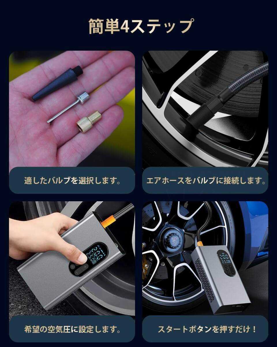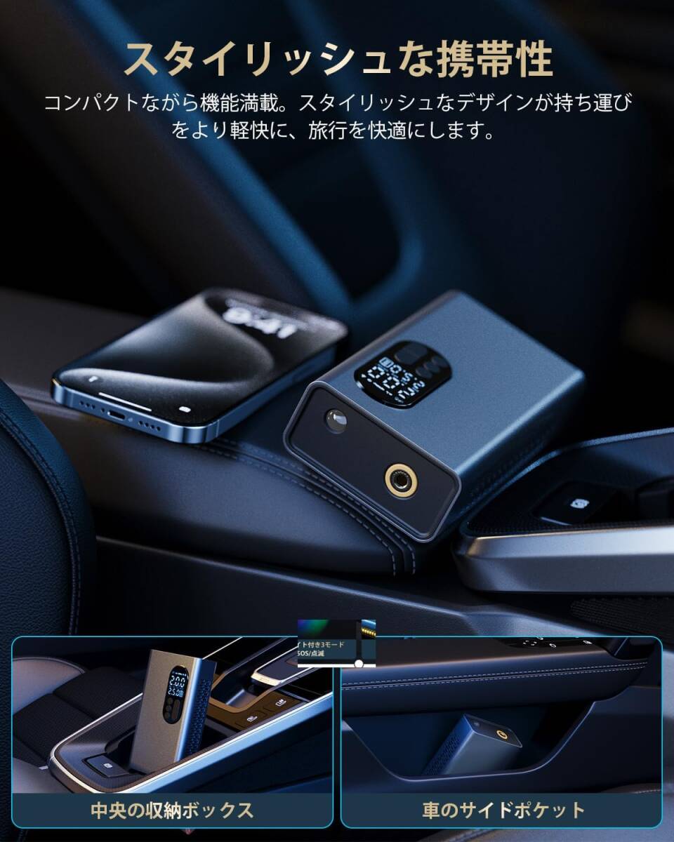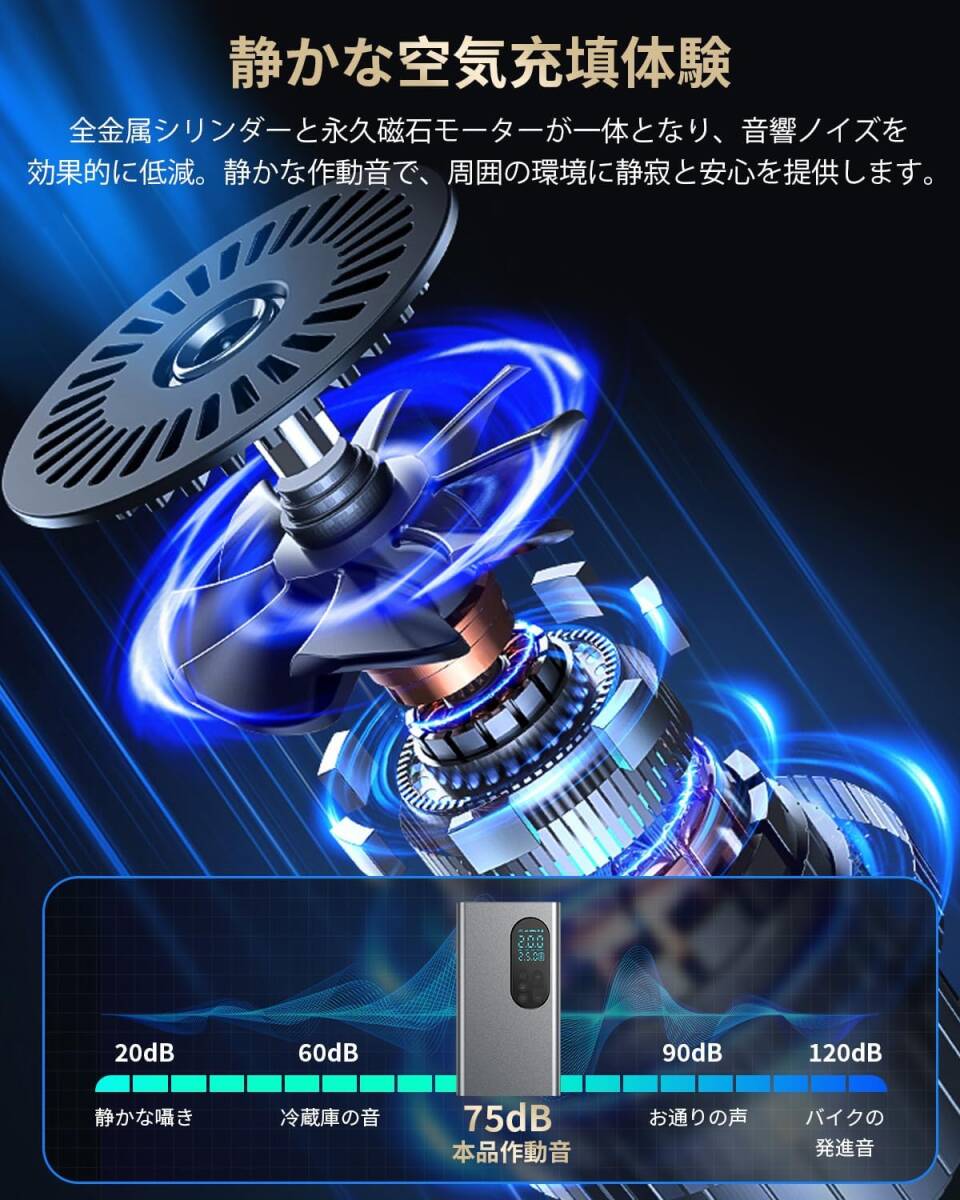 | 【大容量&パワフル】6000mAh大容量バッテリーで、コードレス空気入れは一度充電して12つの自動車用タイヤに充填できます。また、USB出力端子が付いているため、携帯のようなデバイスや小型電気への充電も可能です。白色照明、緊急SOS及びフラッシュの3パターンLEDライトが付いており、夜間作業でも効率よくできます。 【五つの知能モード搭載&急速な熱放散】全種類の自動車、オートバイ、自転車のみならず、全てのボールやエアー玩具にも使えます。空気圧を最大150psi(10.3bar)までセットできるので、各種車タイヤに対応できるだけでなく、効率も大部向上します。コンパクトのエアーポンプ本体の左右両面に排熱穴を搭載しており、長時間使用しても熱くならない、安心してご利用ください。 【大画面LCD液晶表示&4種単位対応】切替ボタンを押すと圧力の単位を「PSI」「BAR」「KPA」「kg/cm」の4種類から選択できます。空気圧の単位、空気入れモード、バッテリー残量、セットした空気圧や空気圧のリアルタイム数値などの情報が液晶ディスプレイに表示されます。詳しい使い方は本空気いれ専用の日本語取扱説明書をご参照ください。 【自動OFF機能搭載&10秒で充填完了】感知センサーと自動OFF機能を搭載し、予め空気圧をセットしておけば、指定した空気圧になると自動停止します。毎分19000回転のターボコンプレッサーとして効率が従来の電動空気入れより8倍も上がり、10秒でボール1個分を充填できます。 【エアゲージ付&小型軽量】エアゲージが付いており、乗車前に愛車の空気圧をチェックして異常がないかを確認できます。一定のタイヤ空気圧の重要性:タイヤの摩耗を効果的に減らし、燃料消費量を減らし、運転の安全性を確保することができます。小型軽量デザインなので、女性でも手軽にくうきいれを使えます。M17 |