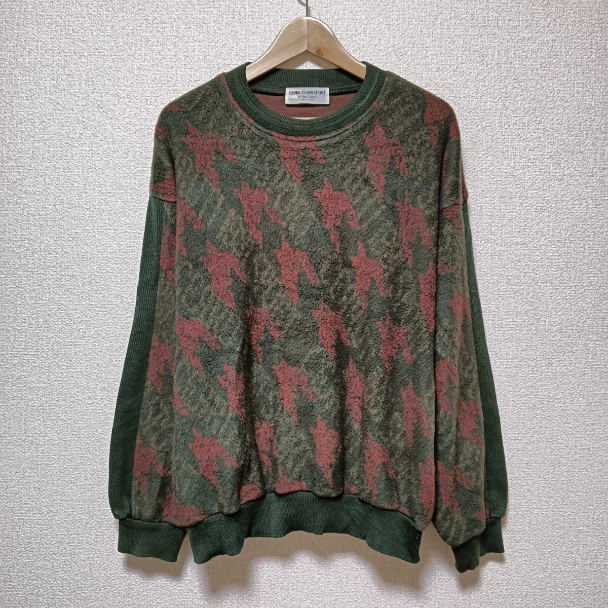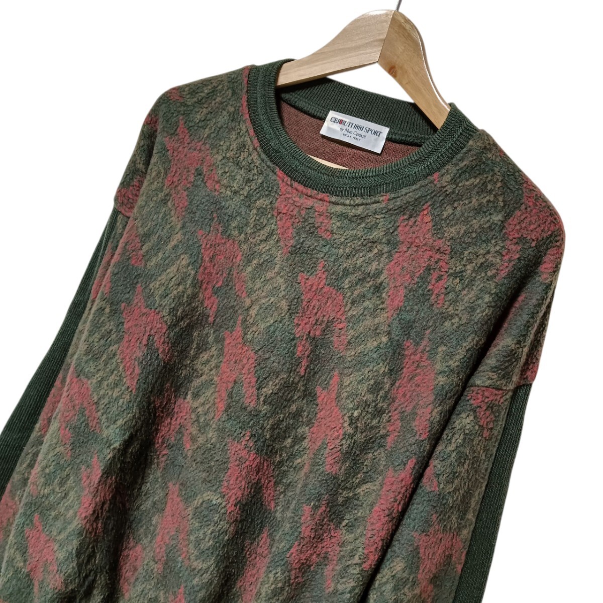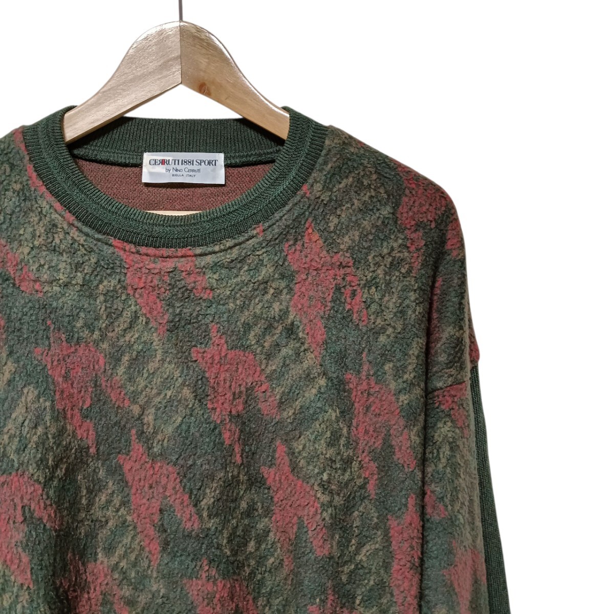 ★CERRUTI 1881 SPORT トレーナー スウェットトップス フリース ウール混 ニット セーター プルオーバー 長袖 ロングスリーブ クルーネック モスグリーン 総柄 マルチカラー ユニセックス レディース メンズ サイズフリー ヴィンテージ オールド セルッティ チェルッティ 古着 USED