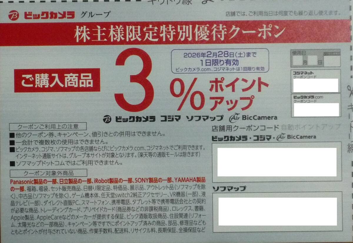 | ■別で出品しているビックカメラ株主限定クーポンとクーポンコードは同番号ですので、重複してご落札されないようお願いします。 |