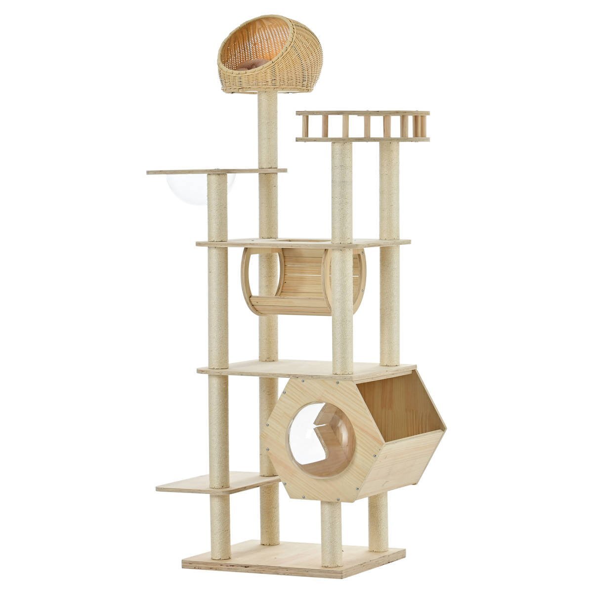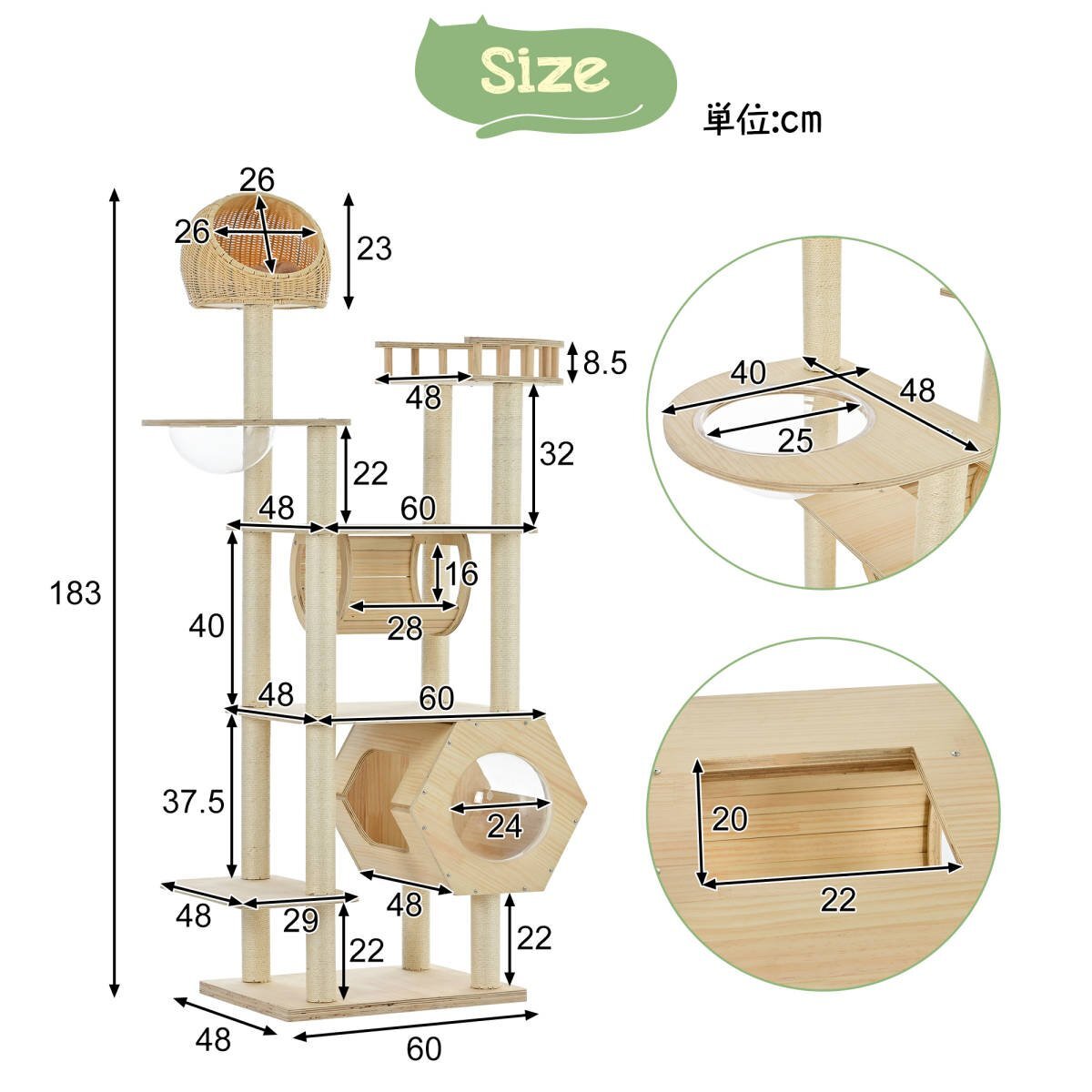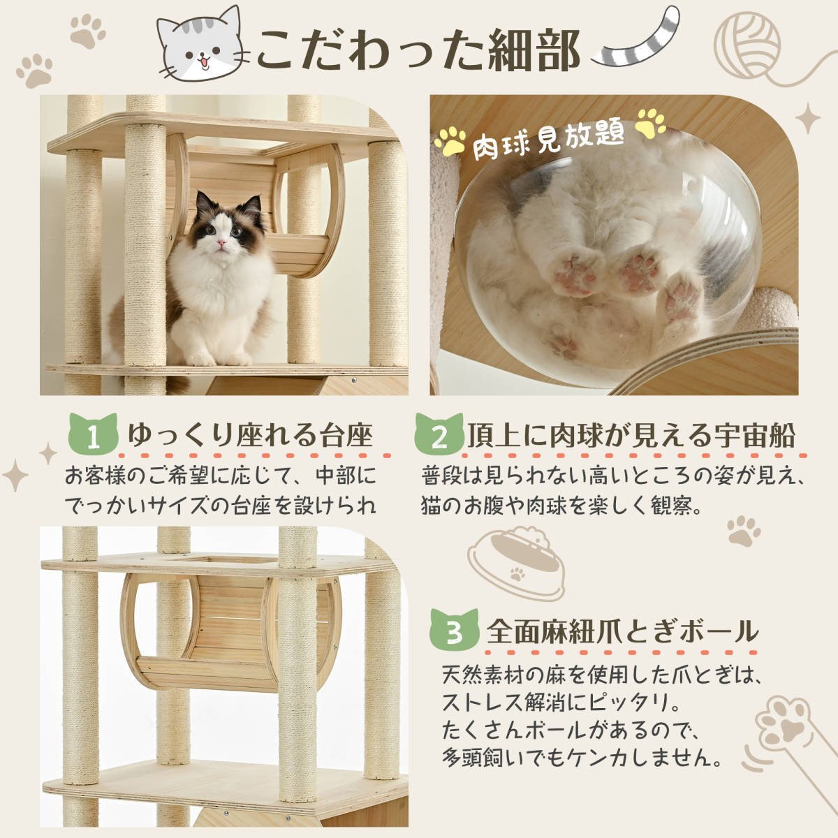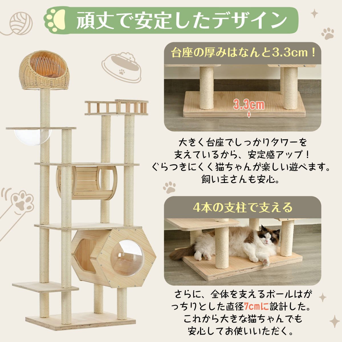キャットタワー 猫タワー ネコタワー 多頭飼い 高さ183cm 宇宙船 隠れ家 爪とぎポール トンネル付き 据え置き型 組立簡単 (ナチュラル)
