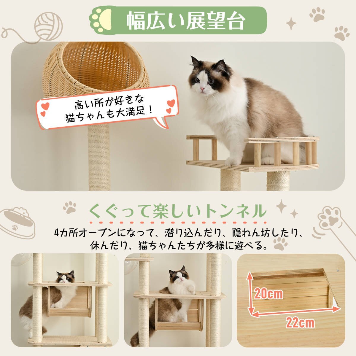 • 【高級感があふれるデザイン】温もりのある天然木、自然の風合いをふんだんに活かしたキャットタワー。キャットタワーの本体は高品質の天然松の木材で作られており、厚みのある高密度のボードは高温高圧処理により、均一な構造と良好な安定性を形成します。