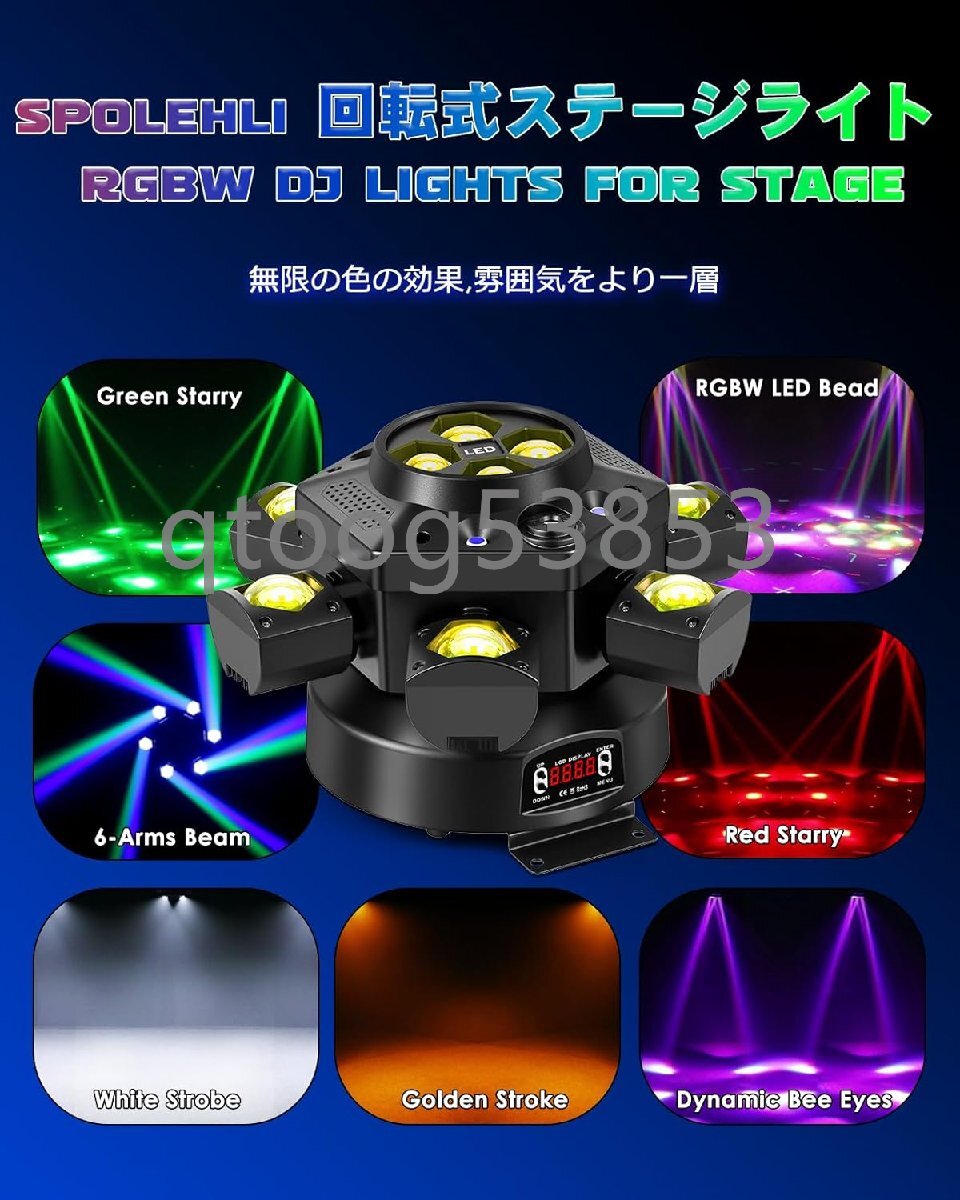 【回転式でスムーズ】このステージライトは中央部に4つのLED、6本のアームそれぞれに1つの10wLEDを搭載し、ビーム/ストロボ/高速スキャン/チェイスなど、いろいろな調光効果に対応でき、多彩なエフェクトが実現できます。中心部が540°回転、各アームが180°回転可能で、無限な光の変化が超スムーズに実現させ、その場面の雰囲気をより一層盛り上げます!
