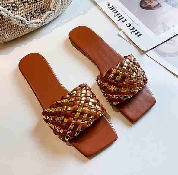 高見えするゴールドの編み込みサンダル