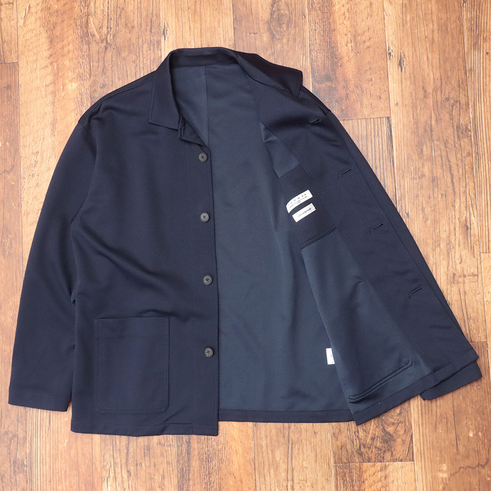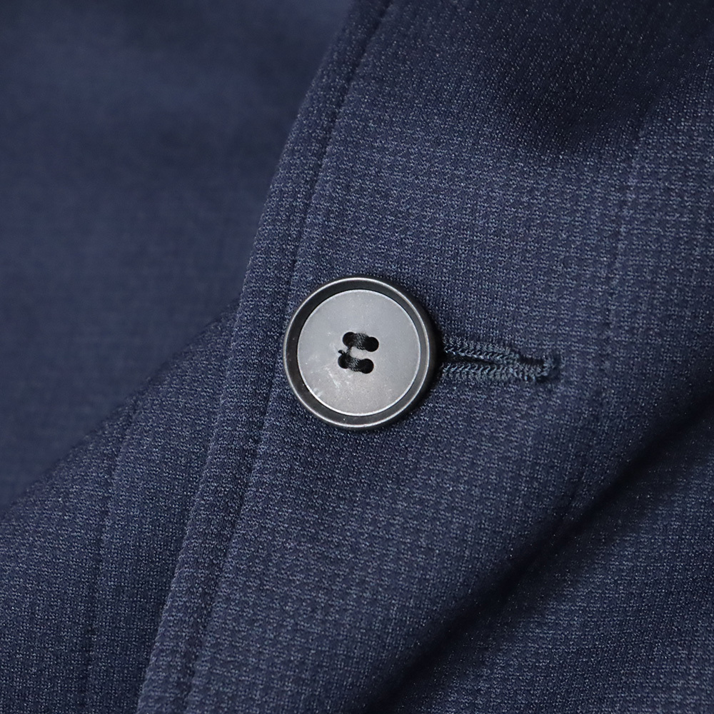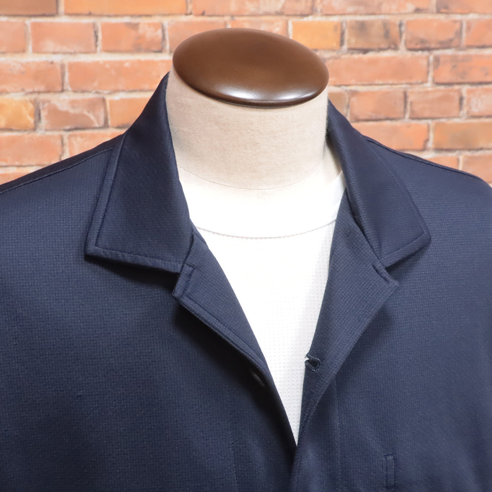 裏面は、ハイゲージのダブルジャージ素材をメッシュ調にして使用。しっかりとした生地感ながらも軽量で、長時間の着用も快適。シワになりにくいため、出張や外出時にバッグに忍ばせても安心です。