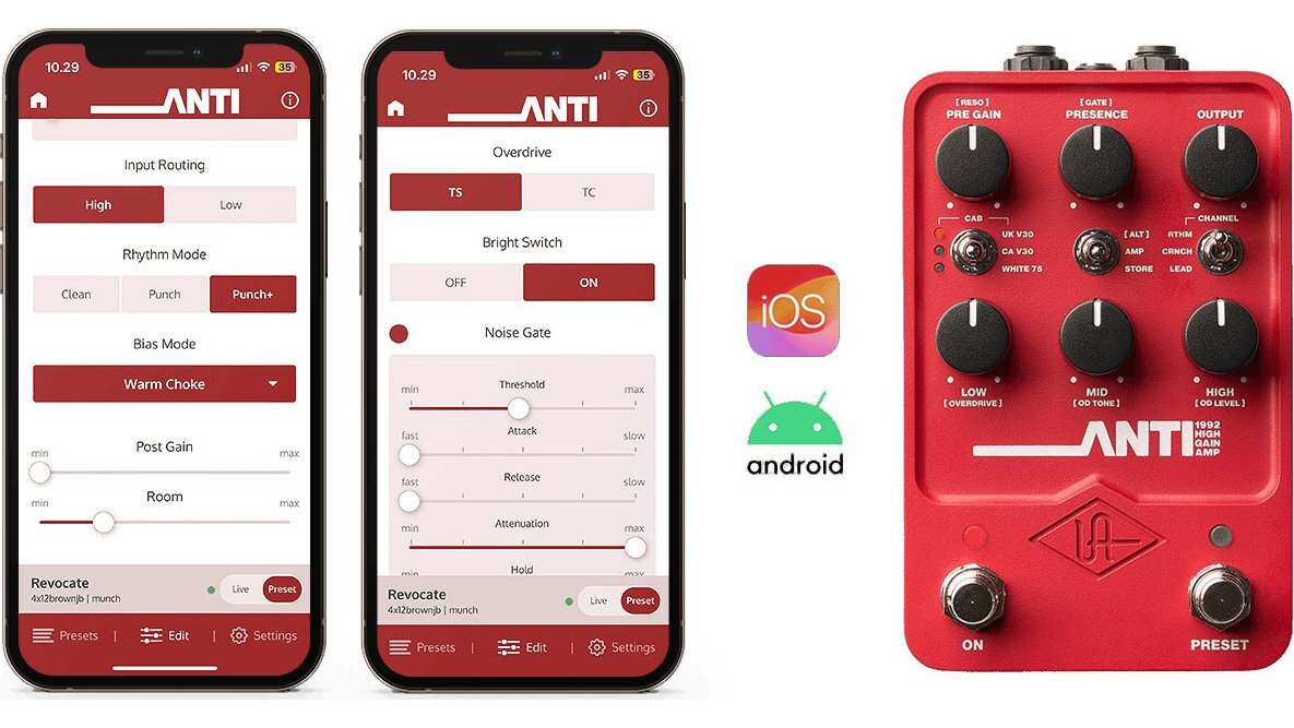 UAFX Controlモバイル・アプリを使えば、ANTIのすべてにアクセスできます。プリセットのカスタマイズ、保存、管理、アーティスト・トーンの呼び出し、そして最大4つの内蔵プリセットとライブモードに対応するフットスイッチ・モードの設定などを、安定したBluetooth接続で行えます。