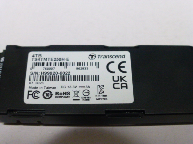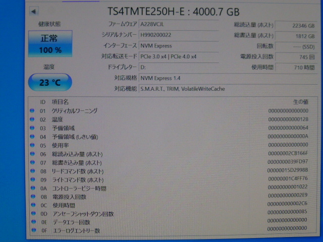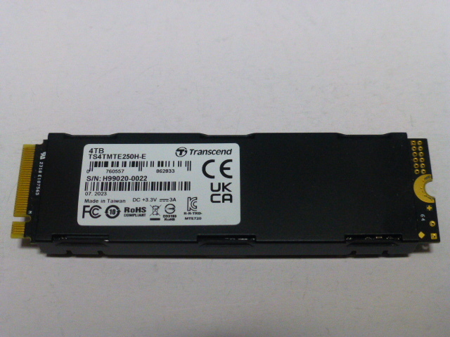 Transcend SSD M.2 NVMe Type2280 Gen 4.0x4 4TB(4000GB) 電源投入回数745回 使用時間710時間 正常100% 中古品です TS4TMTE250H-E