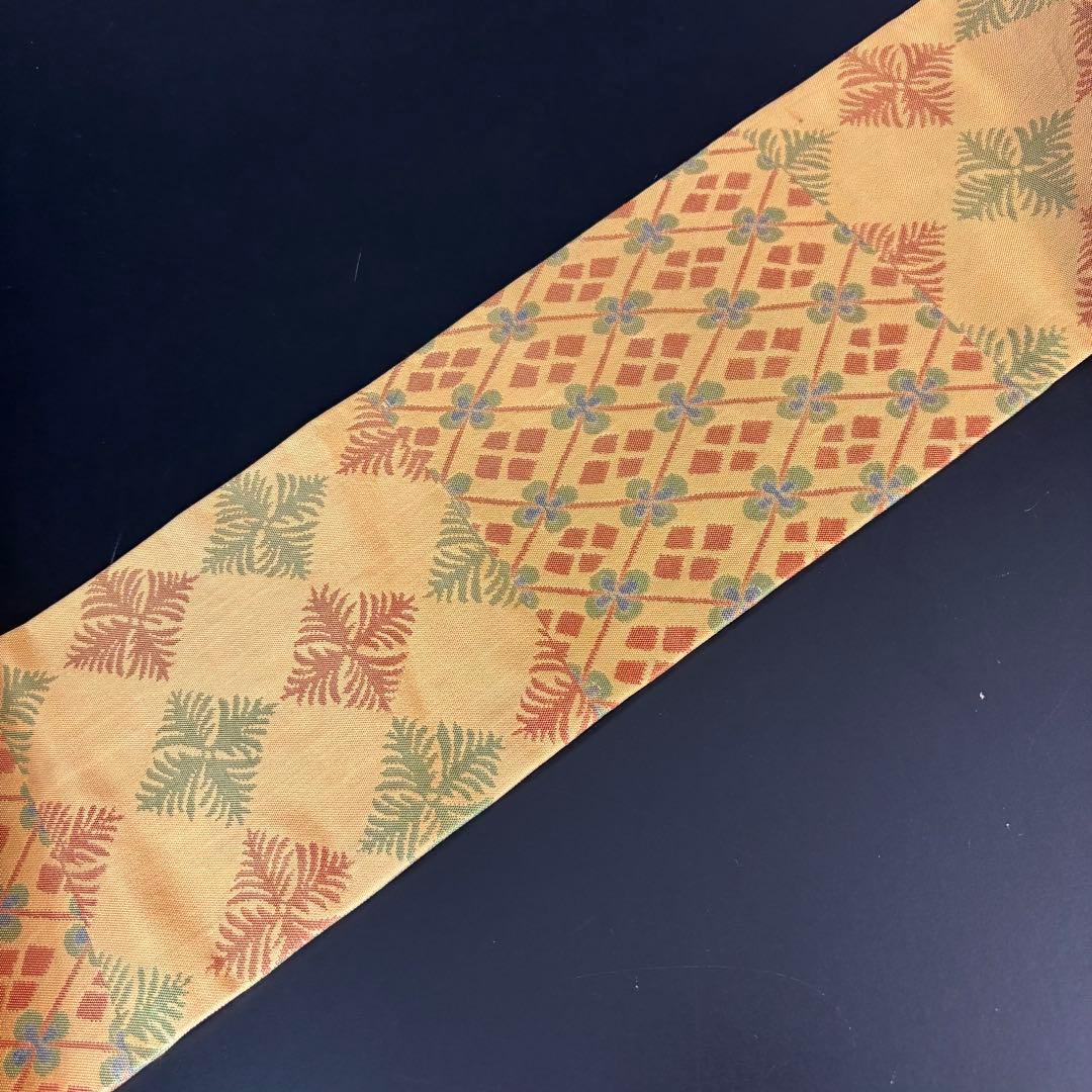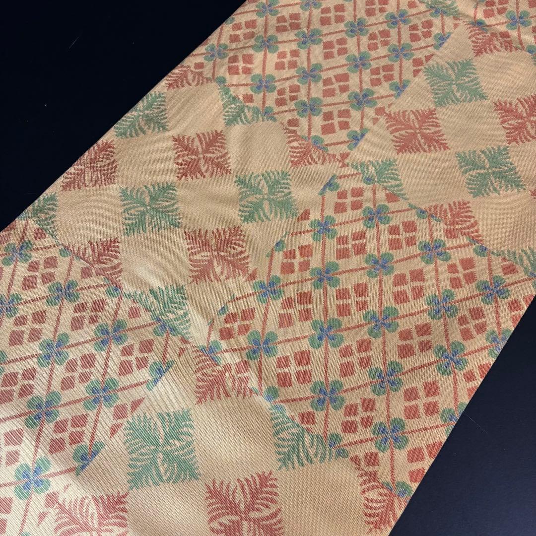 少しスモーキーなベージュの地色に、杉菱柄や三重襷柄が織り出された柄行、配色共にセンスが良いお洒落な名古屋です。