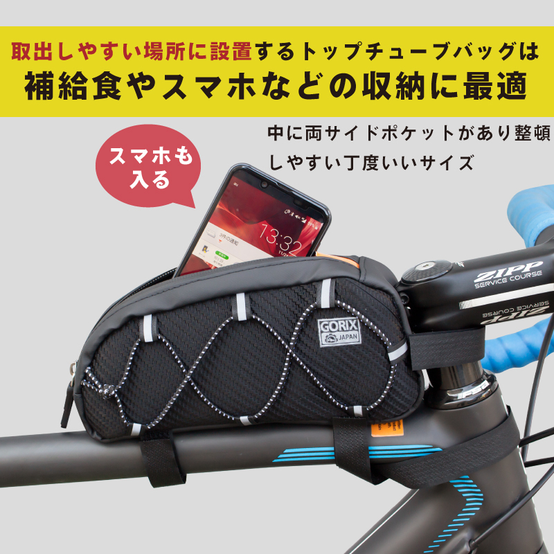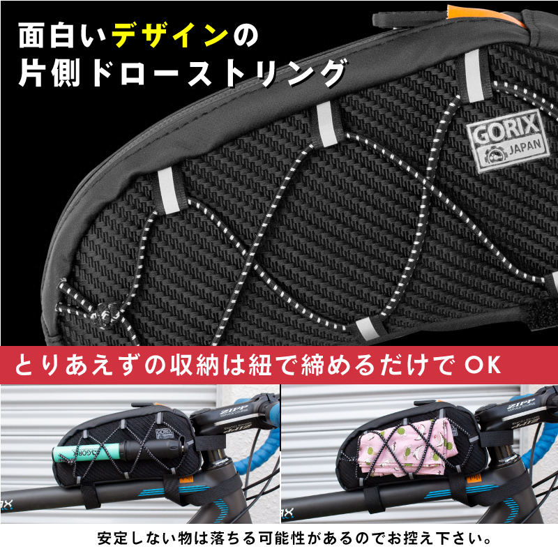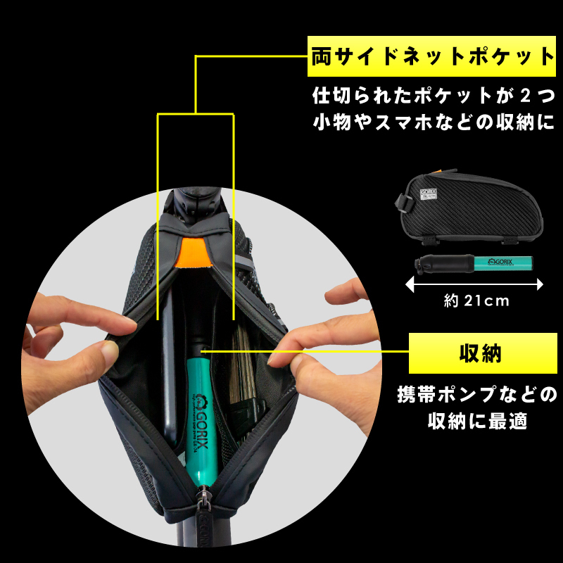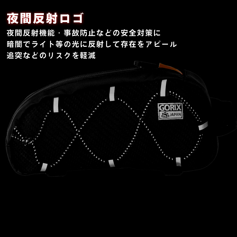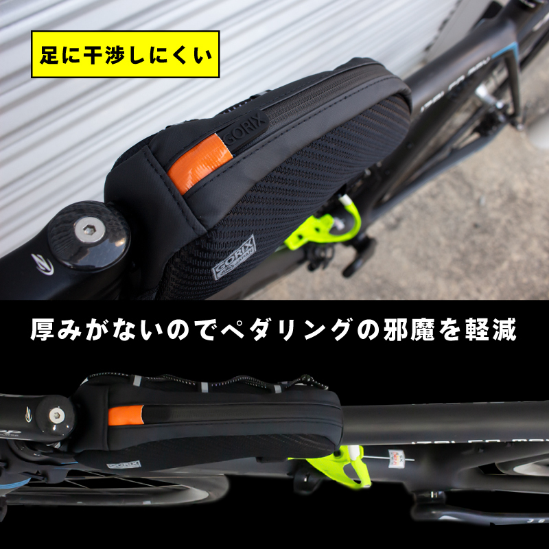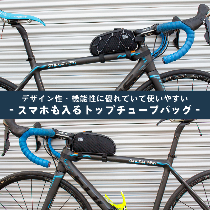 | ロードバイク、クロスバイク、ミニベロ、MTB等に最適なフレームバッグです。 スマートフォンやチューブなどの工具、鍵、補給食などしっかり収納できます。 防水効果で急な雨も気になりません。 厚みがないのでペダリングの邪魔になりにくいデザイン ・補給食やスマホなどの収納に最適 トップチューブバッグは取出しやすい場所に設置するのでよく使うスマホやすぐにとれる補給食の収納に ・止水ファスナー仕様 細部にも施された防水対策 止水ファスナーでファスナーを閉めるとテープが密着して防止性を高めます。 ・厚みが少なくペダリングの邪魔になりにくいデザイン ・夜間反射ロゴ 夜間反射機能・事故防止などの安全対策に 暗闇でライト等の光に反射して存在をアピール 追突などのリスクを軽減 ・生活防水IPX4 防水加工が施されていて雨天のサイクリングをサポート 材質:210D Nylon + TPU 防水素材 サイズ:約22x10cm 幅5cm 重量:約105 g 附属ベルト取付可能径:約φ3-5cm 最大容量:約0.75 L 収納仕様:左右側ネットポッケト各1つ 防水仕様:防水レベルIPX4※完全防水ではありません。 | |