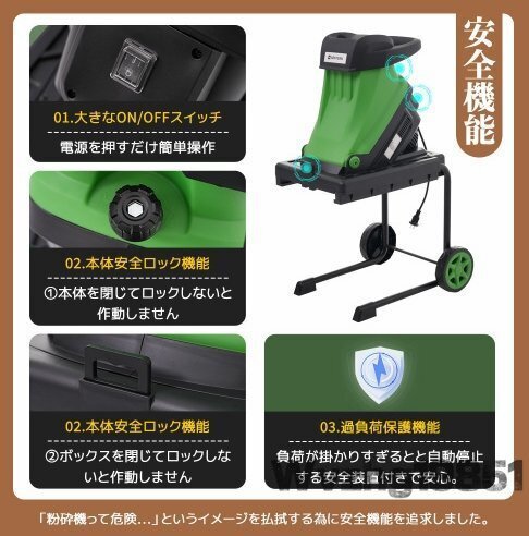 【操作簡単 上から枝を入れるだけ】押し込みスティックで作業もラクラク【太い枝もサクサク粉砕】投入口に厚いゴムのカバーが付いているので粉砕物の飛び散り手などの侵入を防ぎます最大粉砕径40mm ※右側の円筒に粉砕するものを入れることをお勧めします。そうすること