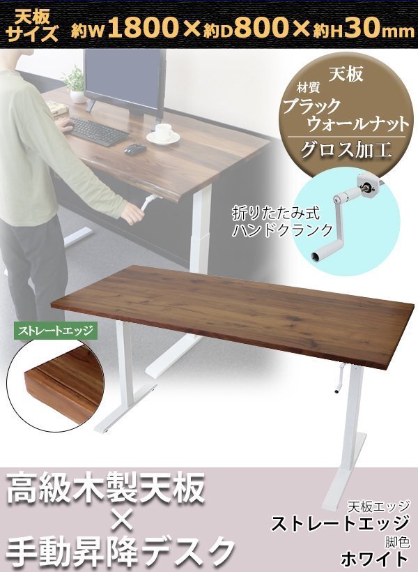 | 商品名 | 送料無料 昇降デスク 手動 W1800×D800×H735~1185mm ブラックウォールナット材 高級 木製 天板 グロス加工 耐荷重約70kg(脚部) スタンディングデスク 上下昇降 デスク 手動昇降 上下昇降 昇降デスク 高さ 調整 オフィスデスク 昇降式デスク 昇降テーブル ストレートエッジ 脚色 ホワイト hk01180bkwag |