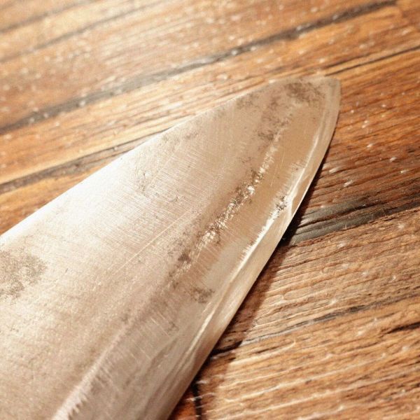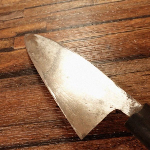 出刃包丁は、魚の頭を落としたり骨を断ったりする場面で活躍する和包丁です。使用感あり、ハガネ特有の黒ずみは多少出ていますが、研いだ刃先はキレイな銀色が出ています。実用的にまだまだ活躍してくれそうなお品です。