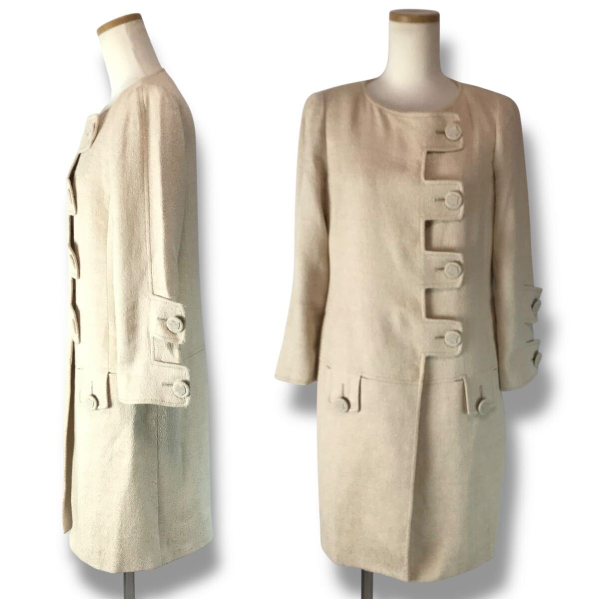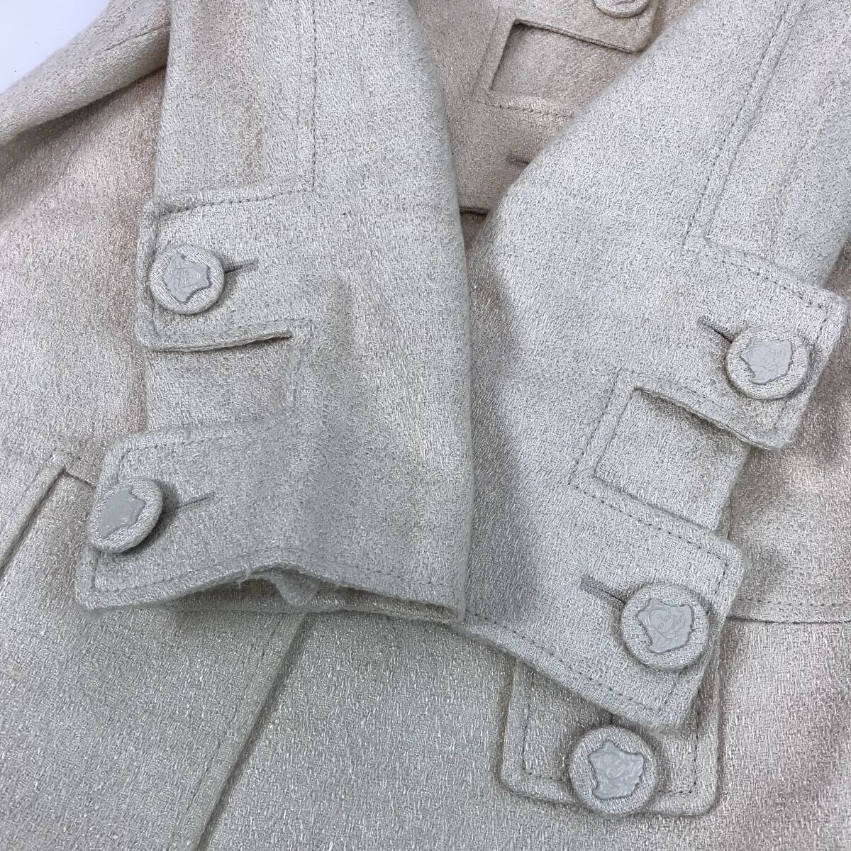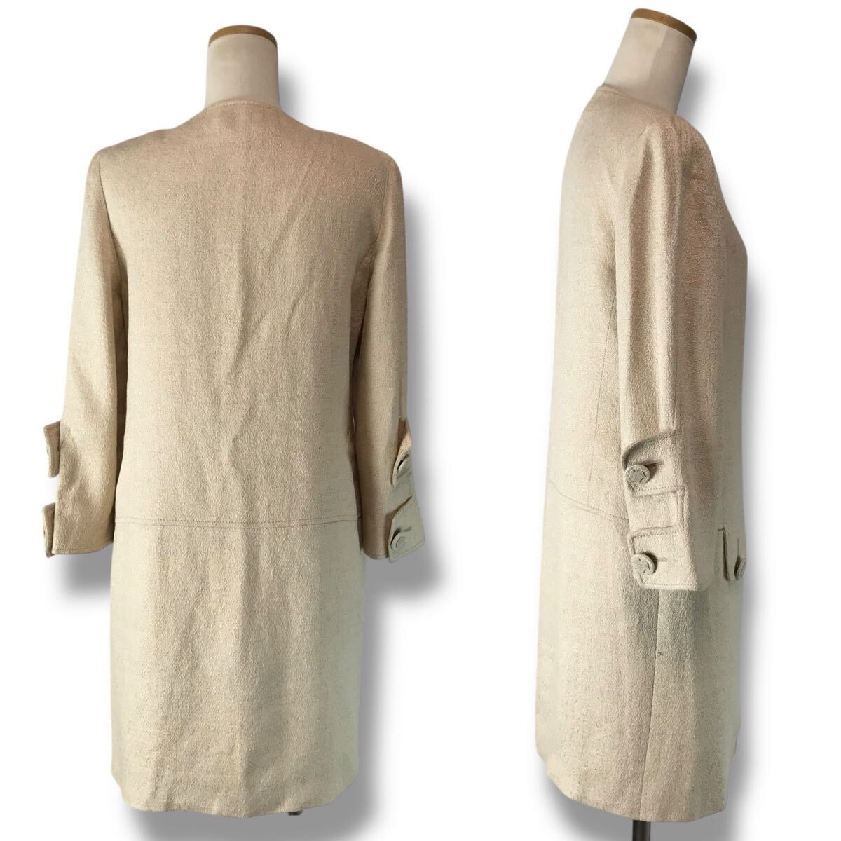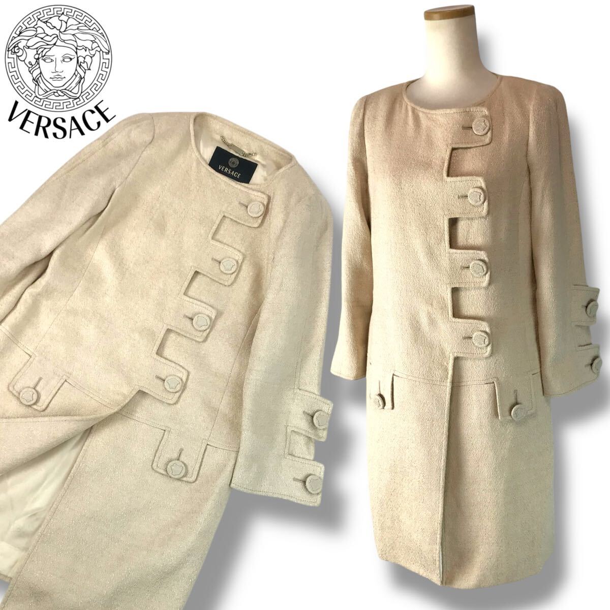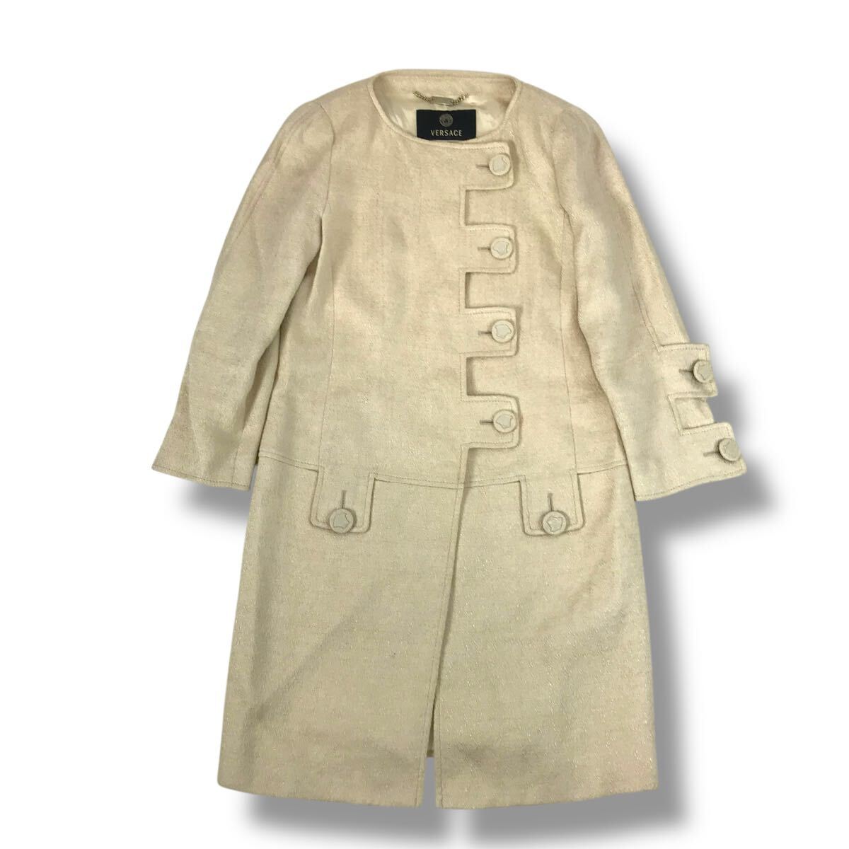 e121 Vintage VERSACE ジャンニ ヴェルサーチ ノーカラー ロングコート ジャケット ライトベージュ メデューサボタン 38 イタリア製 正規品