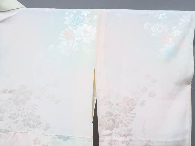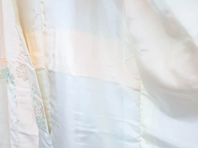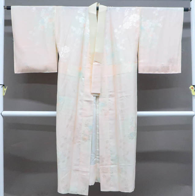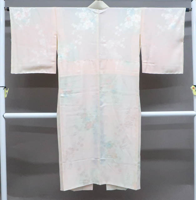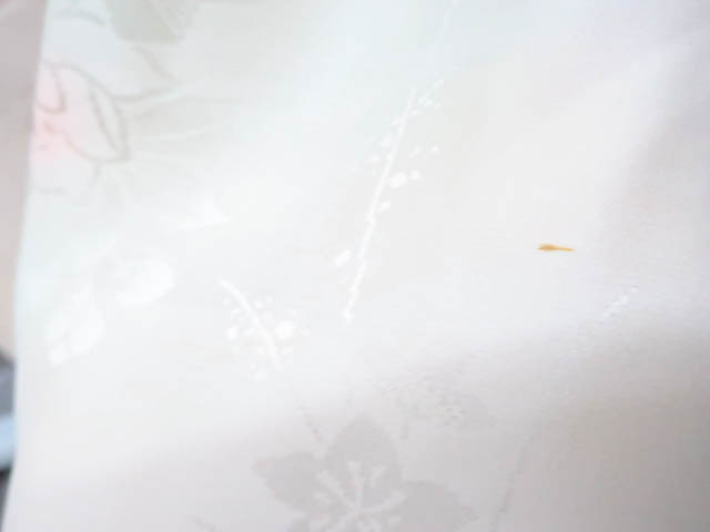 リサイクル商品のため、右前身頃に薄しみがございますがご着用いただけると存じます。 地色は 薄ピンクです。 1枚目の画像が近いお色かと思われます。 素材は正絹です。 |