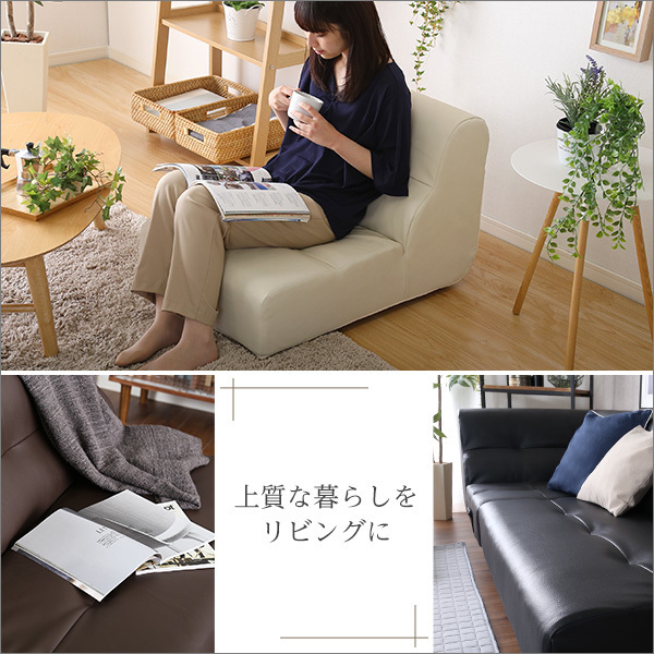 【ポイント】 高級感のあるPVCレザーがワンランク上のお部屋を演出します。 日本製の確かな品質はひとつずつ丁寧に作られた熟練の手によるもの。 座面にはモールド成型とポケットコイルの多層構造で、体にフィットする上質な座り心地と耐久性を実現しました。 ゆったり座れるワイド設計と取替え自由な2種類の脚で、リビングライフの多様性に応える充実のソファです。 |