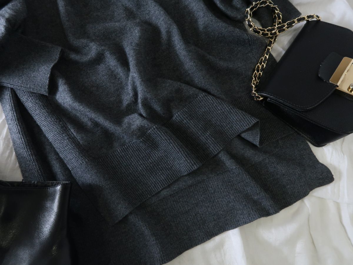 サイドの大きく開いたスリットディティールと、前後差ヘムが抜け感をプラス。
