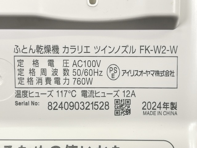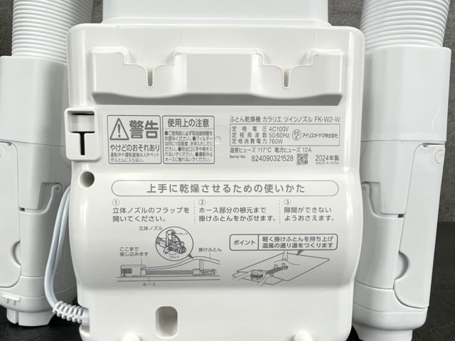 展示品 ふとん乾燥機 カラリエ  【中古】動作保証 アイリスオーヤマ FK-W2-W ツインノズル 2024年製 ホワイト / 514853