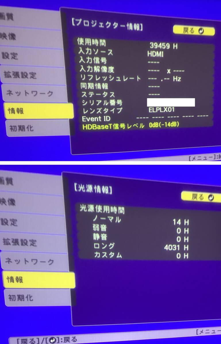 ・出品前の時点でのプロジェクター使用時間は39459時間、光源使用時間はノーマルで14時間、ロングで4031時間です。