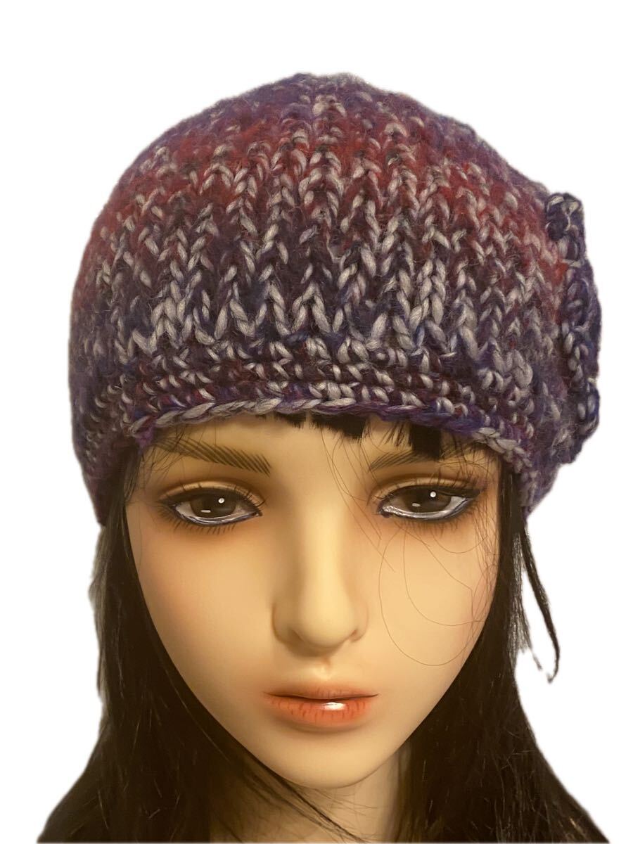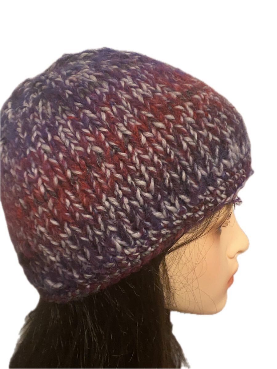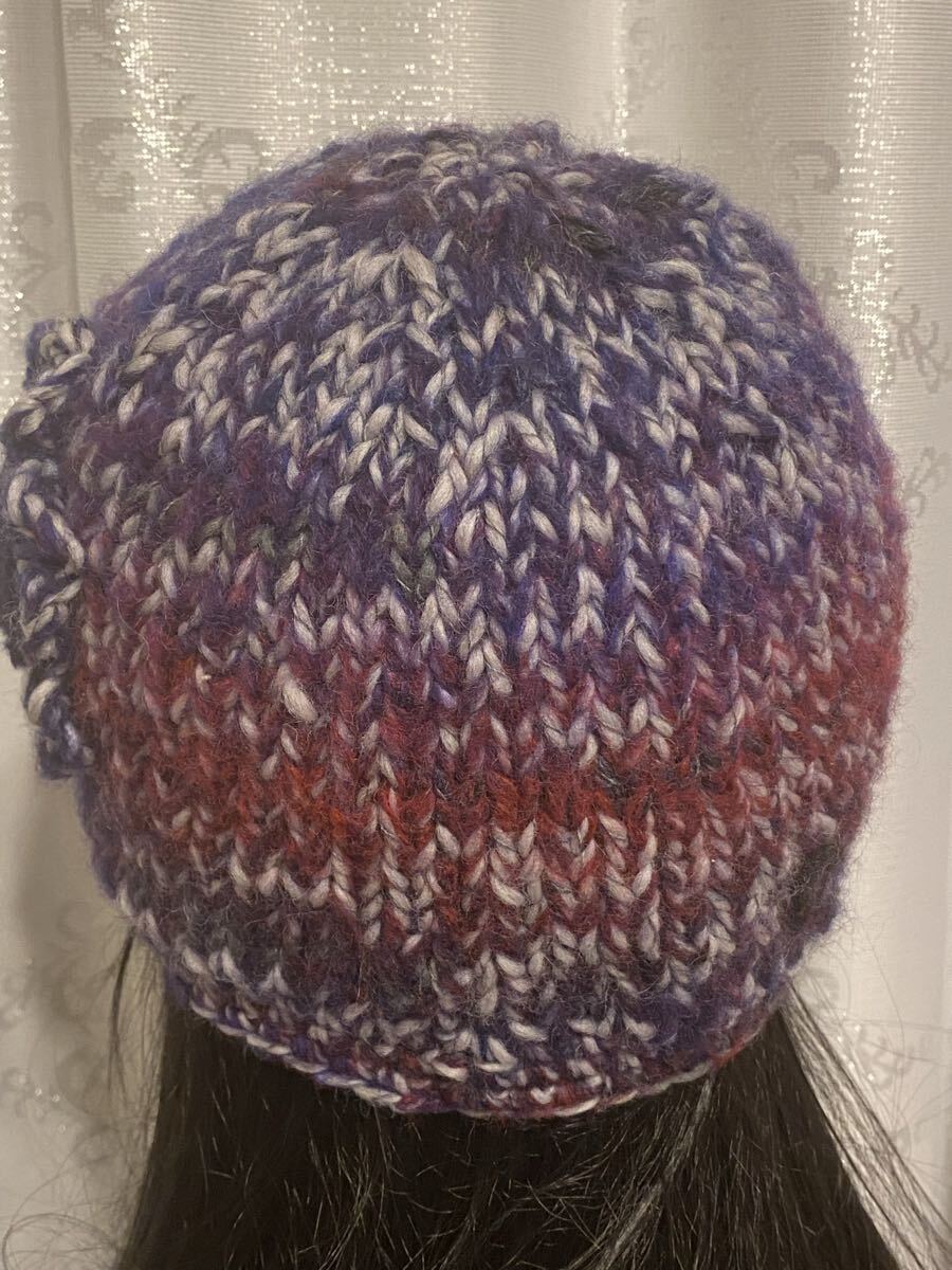 手作りの段染めモヘア糸で編んだニット帽子になります。