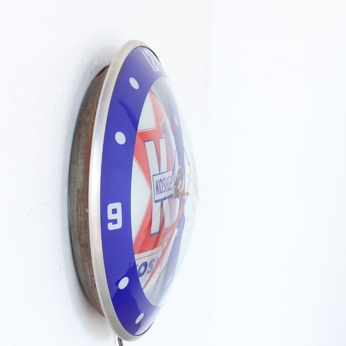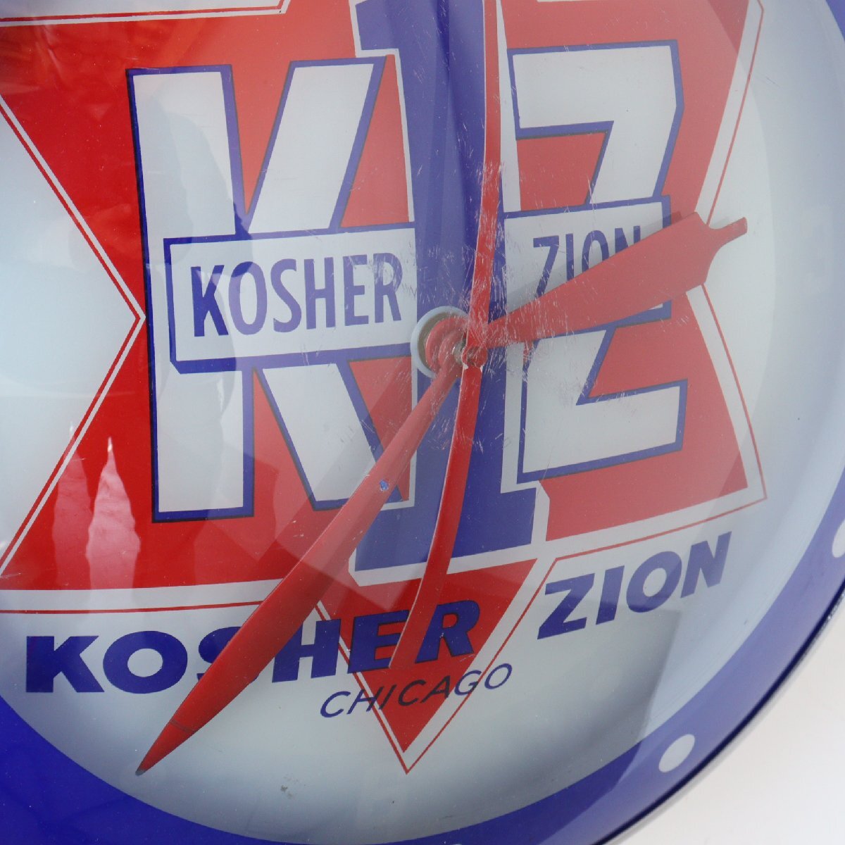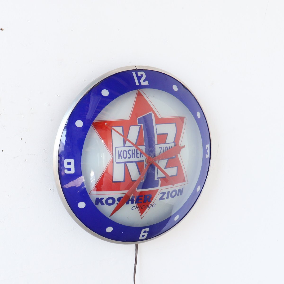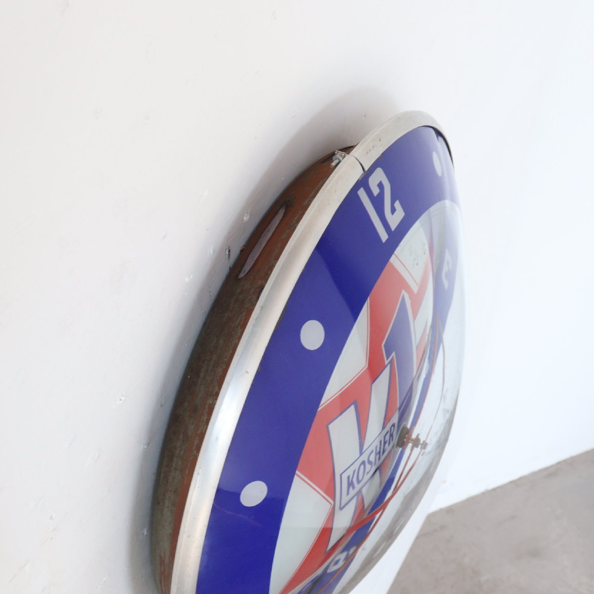 | 商品説明 explanation | 1960年代の「KOSHER ZION」のライト付きアドバタイジングクロックです。 シカゴにあるソーセージなどを作る食肉加工会社で、広告用に使用されていたモノです。 写真では伝わりにくいと思いますが、文字盤と風防どちらも丸みを帯びているガラス製で「ダブルバブルガラス」と呼ばれておりアメリカでも非常に希少です。 ディスプレイするだけで空間に映えます。 ご自宅や店舗にいかがでしょうか 針はオリジナルです。ムーブメントはアメリカで販売されている、高出力(ハイトルク)のムーブメントに交換しています。 カチカチ音がしないスイープタイプで、乾電池で動作し時間はほぼ正確です。 |