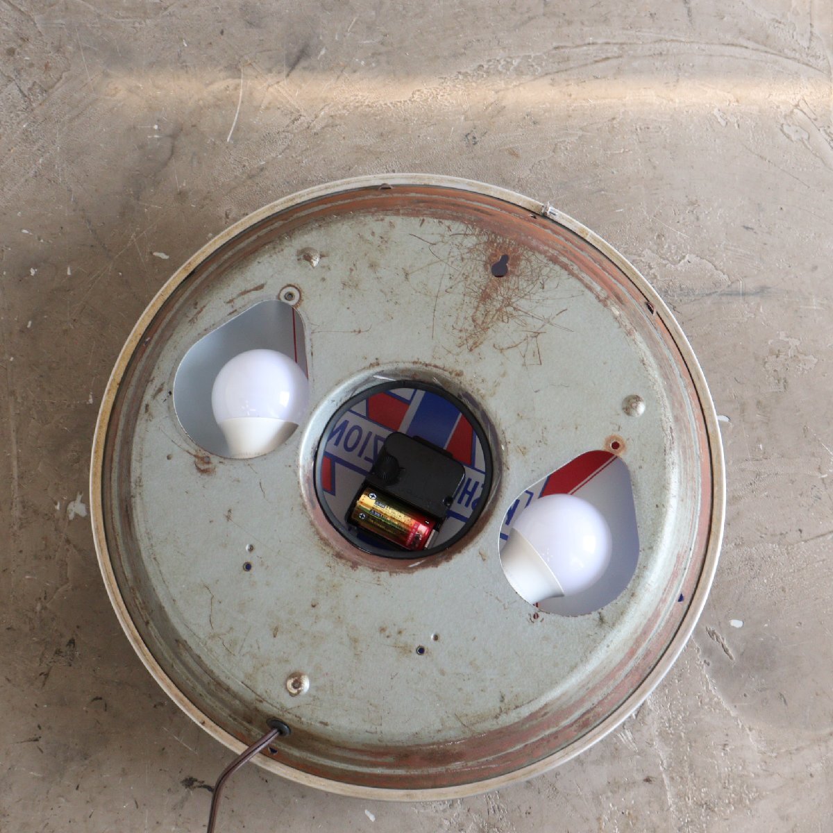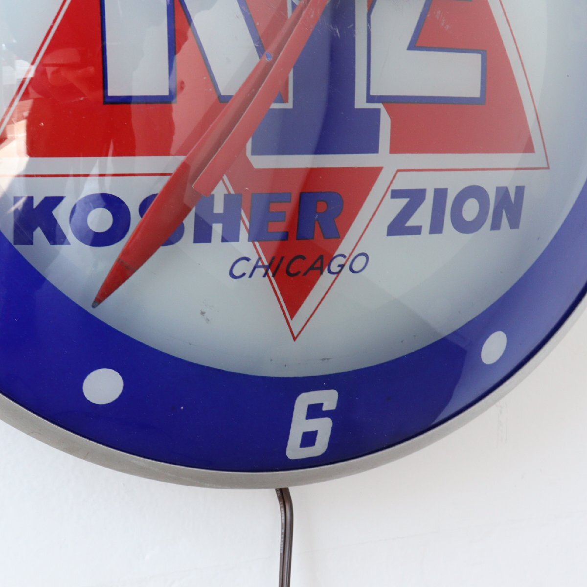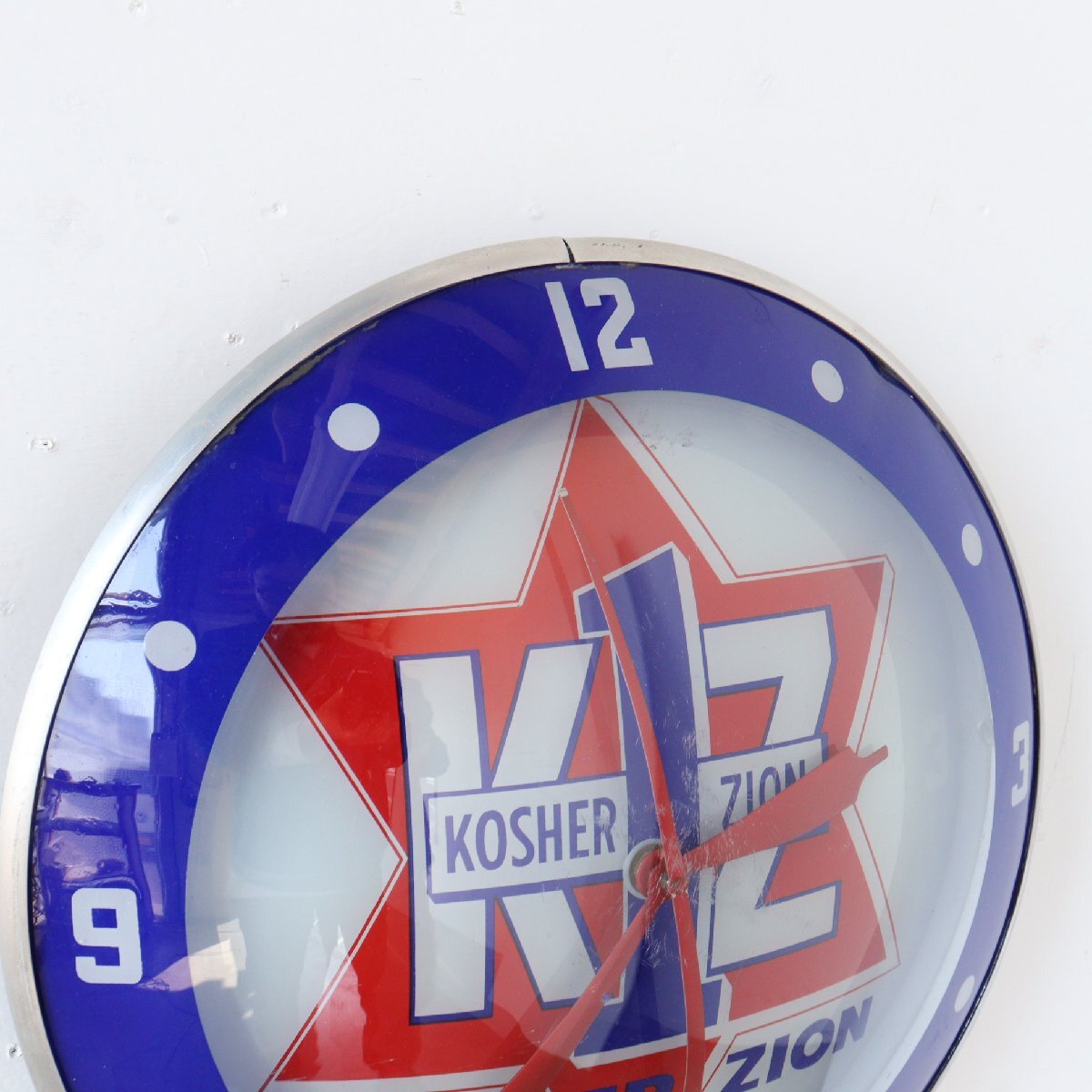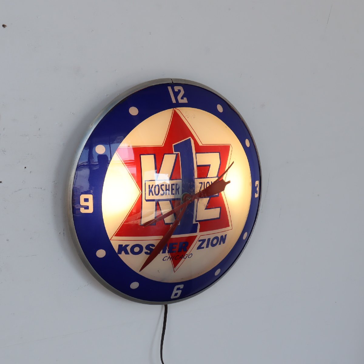 | 商品説明 explanation | 1960年代の「KOSHER ZION」のライト付きアドバタイジングクロックです。 シカゴにあるソーセージなどを作る食肉加工会社で、広告用に使用されていたモノです。 写真では伝わりにくいと思いますが、文字盤と風防どちらも丸みを帯びているガラス製で「ダブルバブルガラス」と呼ばれておりアメリカでも非常に希少です。 ディスプレイするだけで空間に映えます。 ご自宅や店舗にいかがでしょうか 針はオリジナルです。ムーブメントはアメリカで販売されている、高出力(ハイトルク)のムーブメントに交換しています。 カチカチ音がしないスイープタイプで、乾電池で動作し時間はほぼ正確です。 |