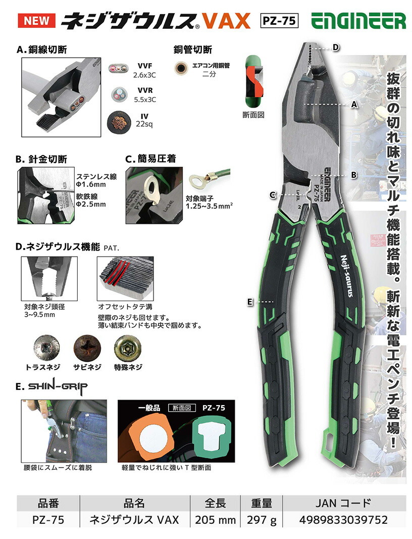 ENGINEER ネジザウルスVAX PZ-75 《抜群の切れ味とマルチ機能搭載、斬新な電工ペンチ!》