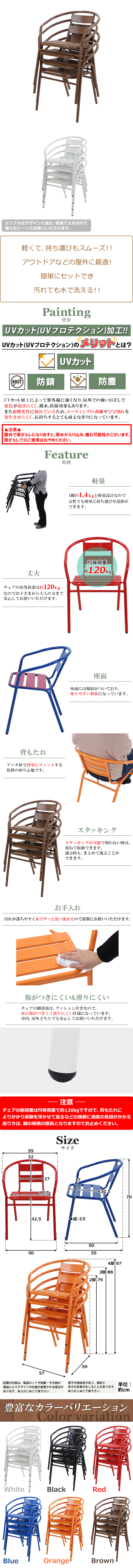 | 商品紹介 | ※こちらのページの商品のカラーはブラウンとなります。 ●スタッキング構造で重ねる事が可能なので、収納やまとめて運ぶ際にも大変便利です。 ●1脚約1.4kgと軽量なので、女性でも軽々持ち運べます。 ●座面には傾斜がついており、座りやすい形状になっています。 ●背中にフィットするアーチ状の背もたれは抜群の座り心地です。 ●汚れが落ちやすく水でサッと洗い流せます。 ●脚裏にはクッションがついているので床を傷つけにくい仕様になっています。 ●材質は、軽量、安全のアルミ製です。 ●耐酸化性に優れているため、コーティングの剥離やひび割れを発生させにくくなっています。 ●UVカット(UVプロテクション)加工によって屋外での強い日差しで変色しにくくなっています。 ●耐水、防錆、防塵性に優れているので屋外で安心してご使用いただけます。 注意! 背もたれによりかかり前脚を浮かせて座るなどの後脚に過度の負担がかかる座り方は脚の破損の原因となりますのでお止めください。 ※こちらの商品は完成品です。 ■重量:約1.4kg(1脚あたり) ■耐荷重:約120kg(1脚あたり) ■材質:アルミ(本体)、プラスチック(脚裏) ●新品商品ではありますが、輸入商品の為、多少の擦り傷などがある場合がございますので、ご納得の上ご購入下さいませ。 ●ご購入後、お客様ご都合によるご返品、ご返金等は一切お受け致しておりません。 ●本商品を使用した際に発生したトラブル、事故につきまして、当社は一切の責任を負いません。ご使用に関しましては、全て自己責任にてお願い致します。 |