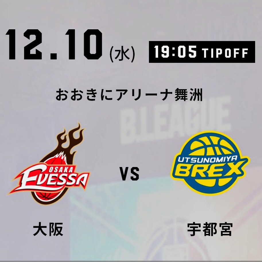 【1枚】12/10(水) バスケットボール 大阪エヴェッサ vs 宇都宮ブレックス 2階指定席 通路側 大人1枚 Bリーグ 招待 チケット