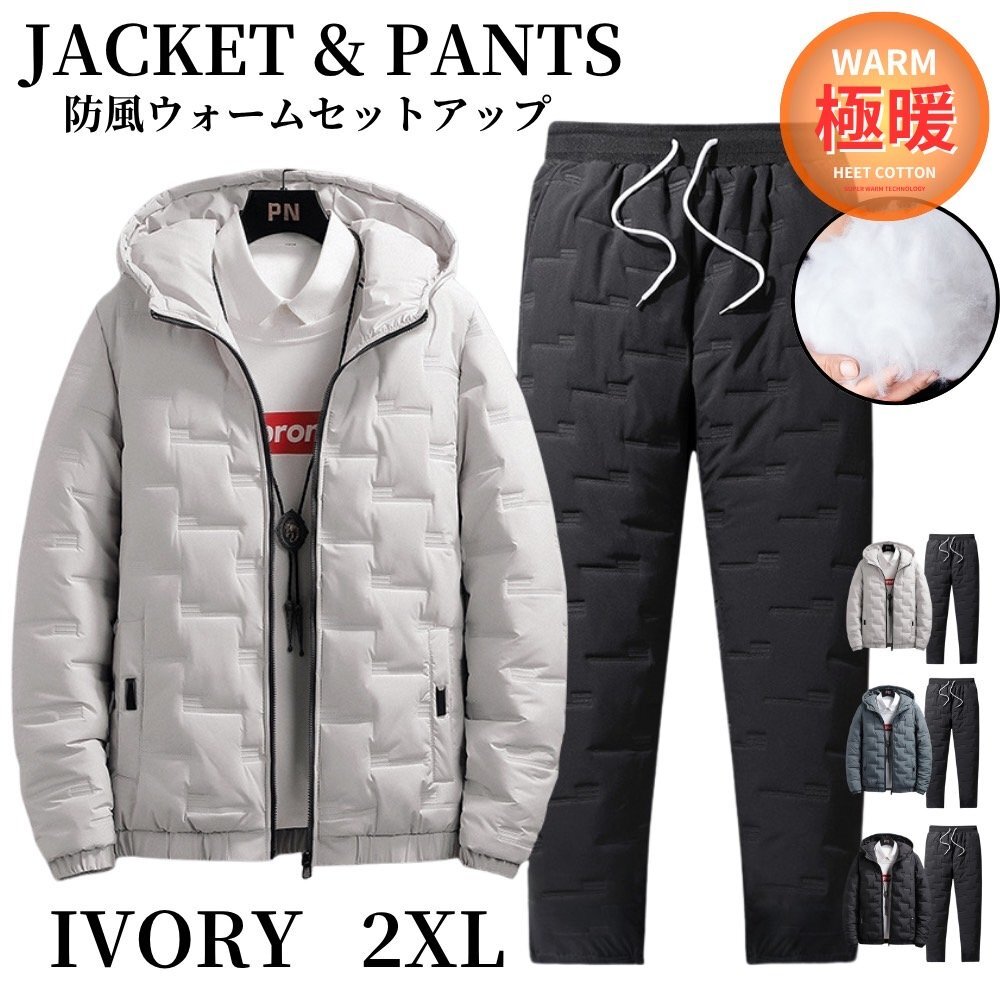 ジャージ上下 セットアップ 中綿上下 メンズ ダウン風ジャケット 上下セット 防寒 防風 蓄熱 ゴルフウェア スポーツウェア アイボリー 2XL