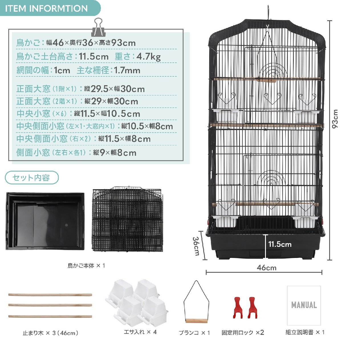 商品名:鳥かご バードケージ 鳥小屋 複数飼い 大きいケージ 大型 インコ セキセイインコ オカメインコ 文鳥 小鳥 ケージ ゲージ 93×46×36cm黒 底網付きで、トレーは引き出し式のため掃除がカンタン。 カナリヤやセキセイインコなどの小鳥の多数飼育でも広々。オカメインコなどでもたくさん飼育できます。 4つのプラスチック製エサ入れと3本の木製止まり木、ブランコ、 2枚の大窓で鳥の出し入れがしやすく、隅々までお掃除可能! 12枚の小窓で小物の配置も自由自在。 持ち手付きでお手軽に移動できます。 組立説明書をお付けいたしますので簡単にご使用いただけます。 ●製品仕様 サイズ(約):高さ93×幅46×奥行き36cm、 重さ4.7kg 付属品: 鳥かご本体(スチール製) トレー(プラスチック) 止まり木:3本 プラスチック製のエサ(水)入れ:4個 ブランコ:1個 固定用ロック:2個 組み立て説明書 |