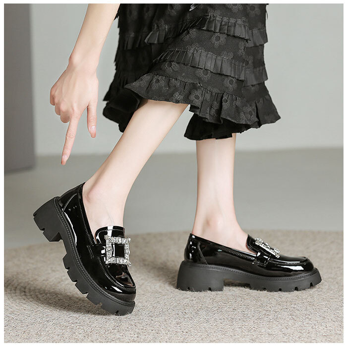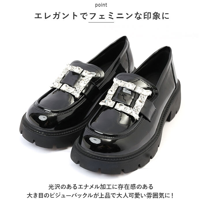 | 商品説明 | ・・きらめくビジューバックルがアクセント!大人可愛いエナメルローファーが登場! ・【エレガントでフェミニンな印象に】 ・光沢のあるエナメル加工に存在感のある大き目のビジューバックルで上品で大人可愛い雰囲気に! ・【スタイルアップ】 ・厚底ソールは履くだけで自然とスタイルアップ! ・【雨の日でも安心】 ・ソールの底面はしっかりと溝が刻まれているので、滑りやすい雨の日でも安心。 ・【こなれ感のあるスタイリングに】 ・合わせやすいシンプルなデザイン&カラー!きれいめコーデの外しアイテムとしてもオススメ♪カジュアルになりすぎず、こなれ感のあるスタイリングを演出! |