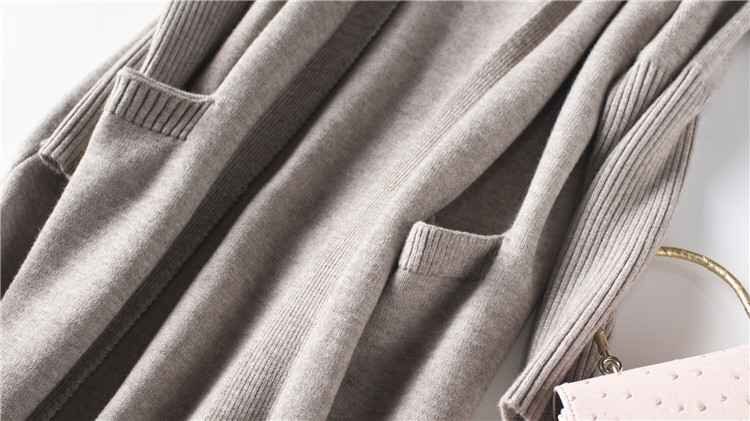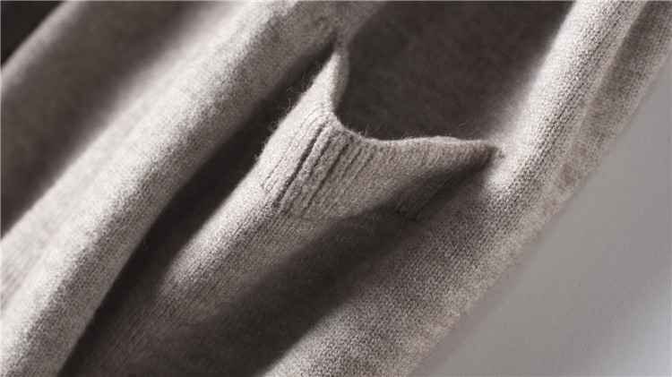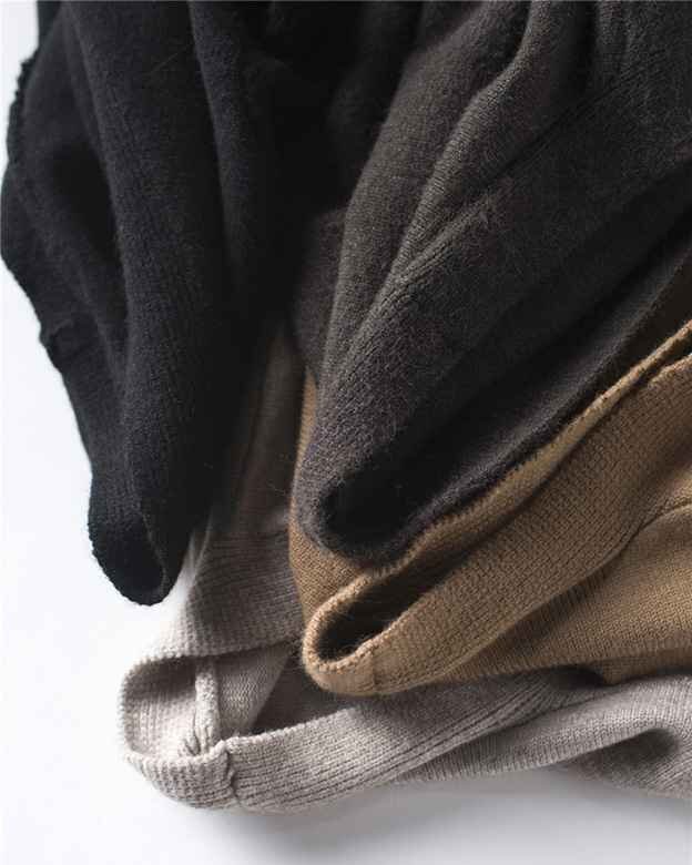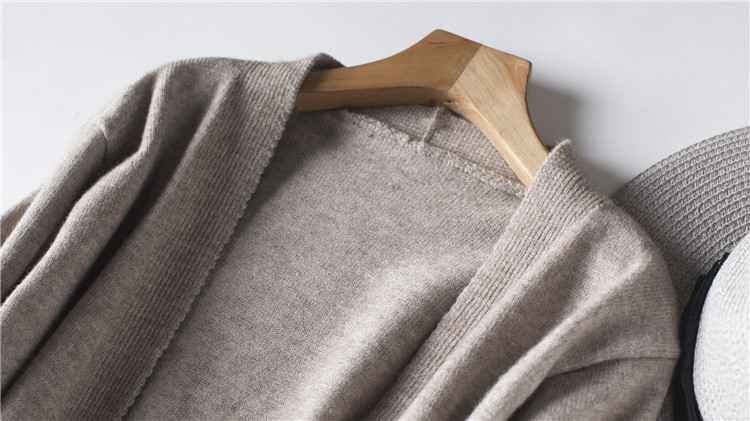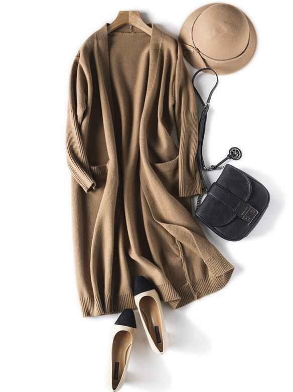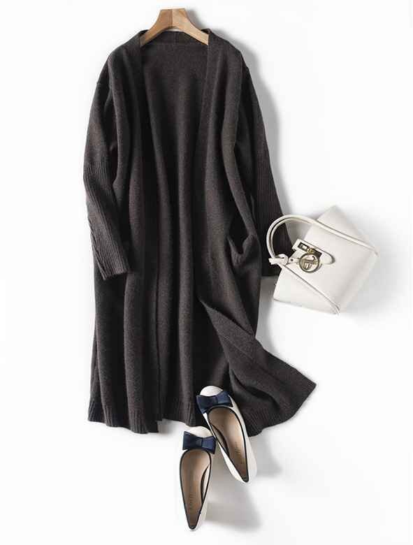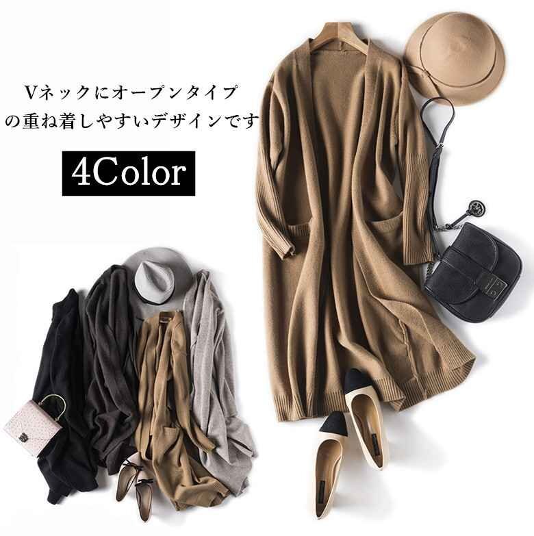 シンプルなノーボタン、Vネックにオープンタイプの重ね着しやすいデザインです。