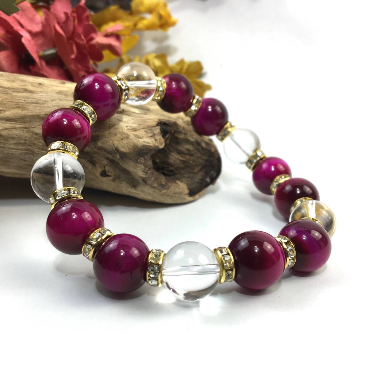 こちらは、ピンクタイガーアイと水晶を組み合わせたパワーストーンブレスレットです。間にはロンデルを挟み高級感あるデザインに仕上げております。石大きさは12mm玉を使用して内径約18cmです。気になる方は是非この機会にどうぞ。