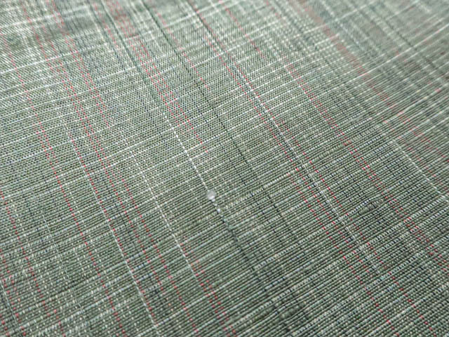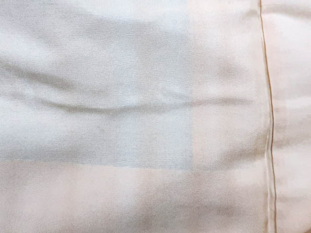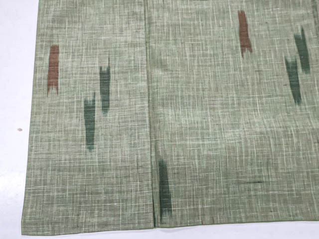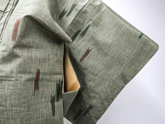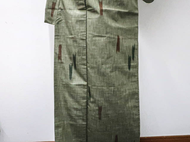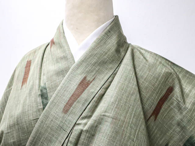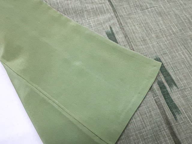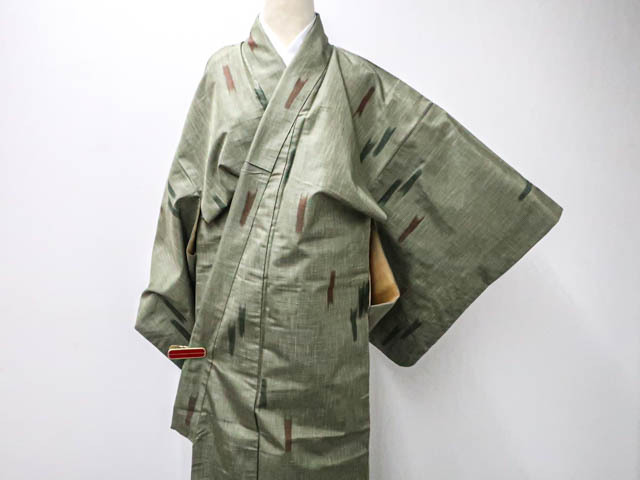 リサイクル商品のため、後身に生地スレがございます。 胴裏と後身にしみがございますが着用可能なお品です。 地色は 灰緑です。 1枚目の画像が近いお色かと思われます。 素材は正絹です。 |
