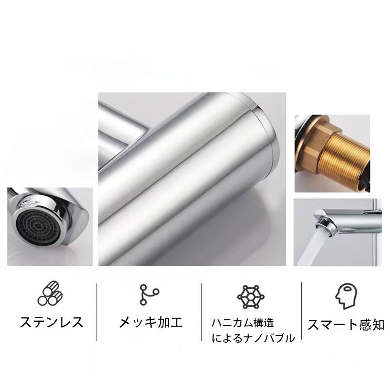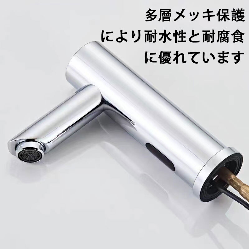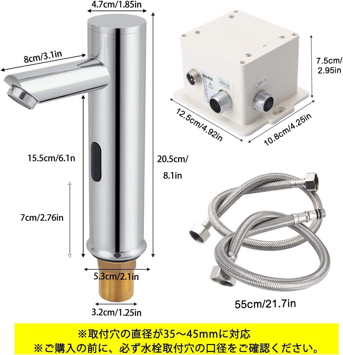 商品の仕様】取り付け穴は35-45 mmの洗面台を対応しています。 材質:銅、 表面処理:クロームメッキ、電源:単3アルカリ乾電池4本(別売)、使用場所:洗面・手洗、給水圧力:最低必要水圧0.1MPa 最高水圧0.6MPa、検知範囲:15~30cm(10~15cmに変更できます)、使用環境温度:0.1-45℃、赤外線がない場所