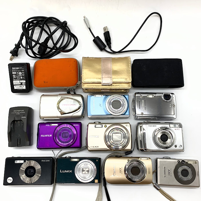 【AN-6】通電確認有 デジカメ10台 FUJIFILM FinePix Panasonic LUMIX RICOH Canon IXY OLYMPUS μ デジタルカメラ おまとめ ケース ケーブル付 現状品 | |||