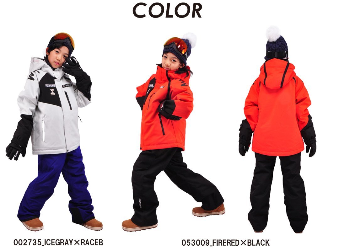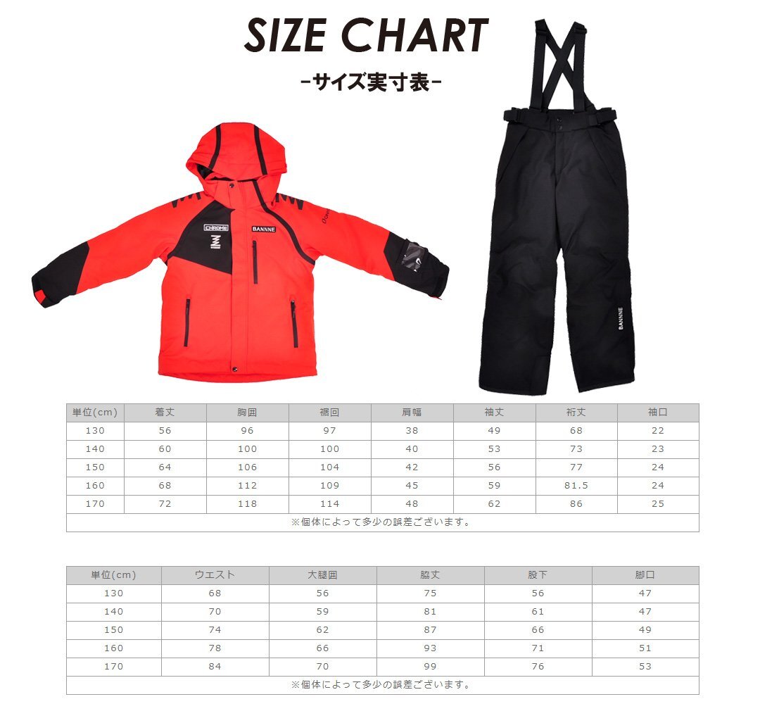 | 詳細 | 北海道に住む私たちが、冬に着たいスノーウェアとは、を考えて作り上げた 当社オリジナルブランド「BANNNE」 BANNNE(バンネ)ブランドより、上位モデルのBANNNE CHROMEシリーズ ジュニアスキースーツです。 こちらのスキーウェアは50年以上の実績を持つオンヨネ社の協力により誕生した高機能スキーウェアです。 耐水圧:15000mm 透湿性:25000g/m2/24hrs の高機能ウェアで、低価格を実現。 高い透湿性で汗による蒸れを軽減。 快適性を維持し、体温の低下も抑えることができます。 防水・撥水素材を採用し、高い撥水性と耐水圧で風や雨・雪の侵入を防ぎます。 スキーやスノボなどのウィンタースポーツはもちろん、通学にもお使い頂けるシンプルデザイン。 サイズ調整機能付きですので、お子様の成長に合わせてご着用頂けます。 【サイズ】 ジャケット: 単位(cm)/着丈/胸囲/裾回/肩幅/袖丈/裄丈/袖口 130/56/96/97/38/49/68/22 140/60/100/100/40/53/73/23 150/64/106/104/42/56/77/24 160/68/112/109/45/59/81.5/24 170/72/118/114/48/62/86/25 パンツ: 単位(cm)/ウエスト/大腿囲/脇丈/股下/脚口 130/68/56/75/56/47 140/70/59/81/61/47 150/74/62/87/66/49 160/78/66/93/71/51 170/84/70/99/76/53 ※個体によって多少の誤差ございます。 【サイズ調整機能】 ジャケット両脇下のストラップ、パンツ内部のストラップで、最大15cmの調節が可能です。 成長の早いお子様でも長く着られるよう考慮しています。 【カラー】 002735_ICEGRAY×RACEBLUE アイスグレー×レースブルー 053009_FIRERED×BLACK ファイヤーレッド×ブラック 257009_KHAKI×BLACK カーキ×ブラック 735053_RACEBLUE×FIRERED レースブルー×ファイヤーレッド 【素材】 ・表地:ポリエステル100%(ポリウレタンラミネート加工) ・裏地:ポリエステル100% ・中わた:ポリエステル100% 【耐水性】 耐水圧:15000mm 透湿性:25000g/m2/24hrs 【機能】 ジャケット: ・フード取外し可能 ・襟裏トリコット ・左袖パスケース(収納可能) ・裾ドローコードで調整可能 ・袖口はマジックテープにて調節可能 ・フロントポケット2か所 ・左胸ポケット1か所 ・サイズ調節機能付(最大15センチ) パンツ: ・サスペンダー(取り外し可能) ・ウエストアジャスター ・前ポケット2箇所 ・雪の浸入を防ぐ足口スパッツ ・サイズ調節機能付(最大15センチ) ・スキー板等との接触で傷みやすい内裾にエッジガード付 |