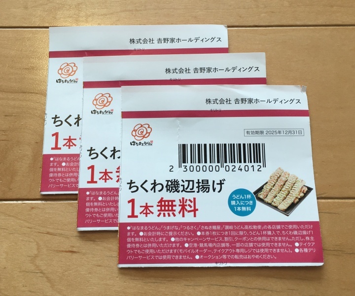 郵便の改悪で発送から到着まで数日、遅いと1週間以上かかる場合もあります。 まれに到着が遅いとクレームを言う方がいますが、郵便事情について私にクレームを言われてもどうしようもありません。 また、通常は入金の翌日にはポストに投函しますが、まれに日常生活の都合で発送までに数日かかる場合があります。 お急ぎの方は、発送方法の変更も含めて事前にご相談ください。 はなまるうどんちくわ磯辺揚げ無料券3枚、期限は2025年12月31日です。 他の株主優待券もこちらに出品していますので、よろしければご利用ください。 このオークションは即決ですので、「入札=落札」です。 オークション終了時刻に関係なく、どなたかにご入札を頂いた瞬間に終了になる「早い者勝ち」です。 |
