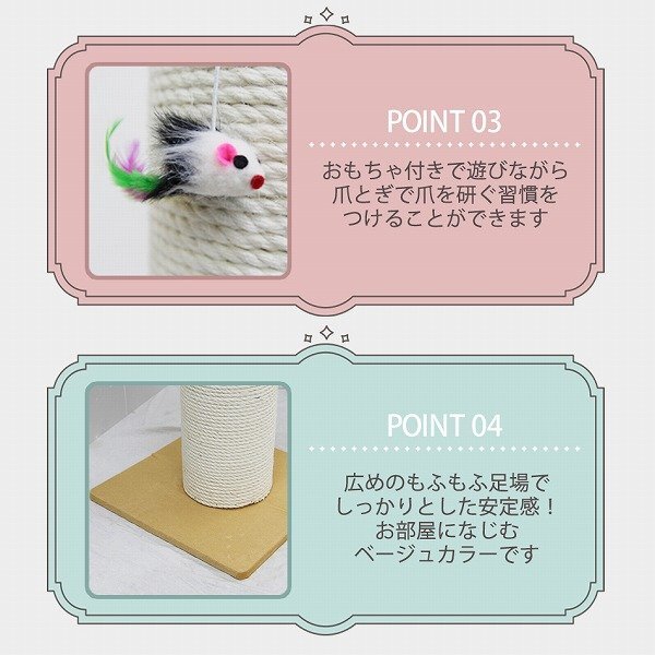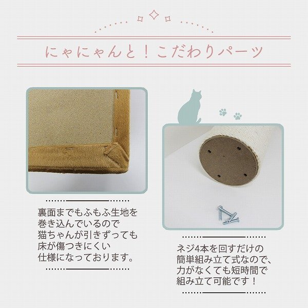約20cmのポールで思う存分つめとぎ放題♪ ネコちゃん大満足に間違いなし! じゃれて遊べるおもちゃ付き。 ■商品仕様 サイズ(約):420×420×624mm 重量(約):4.06kg 材質:麻、ポリエステル ■注意事項 ・こちらの商品はお客様組み立てとなります。 ・製品は接着剤や麻の臭いがすることがあります。臭いが気になりましたら、風通しの良いところで陰干ししてください。 ・海外製品で、簡易梱包での輸入のため風防に擦れや多少の小キズなどがある場合がございますが、商品自体には問題ありませんのでご了承下さい。 ・仕様・デザインは改良のため予告なく変更することがあります。 |