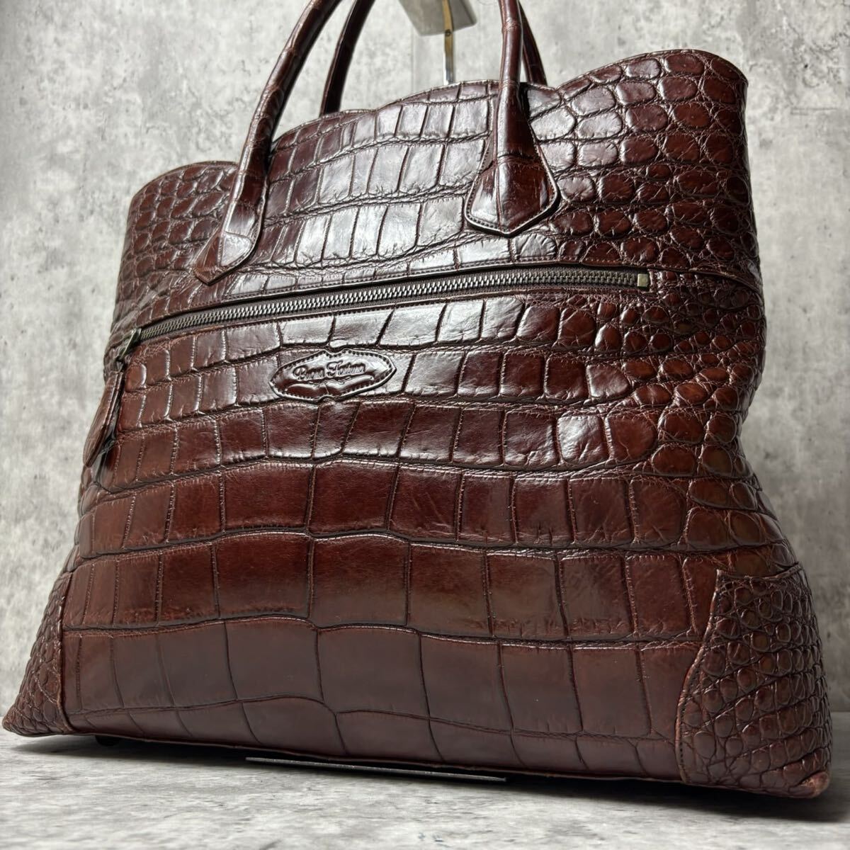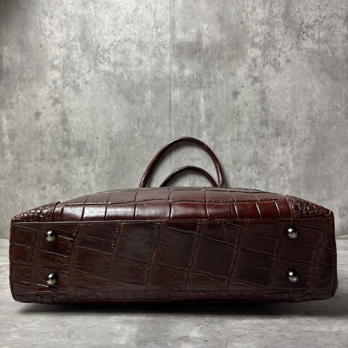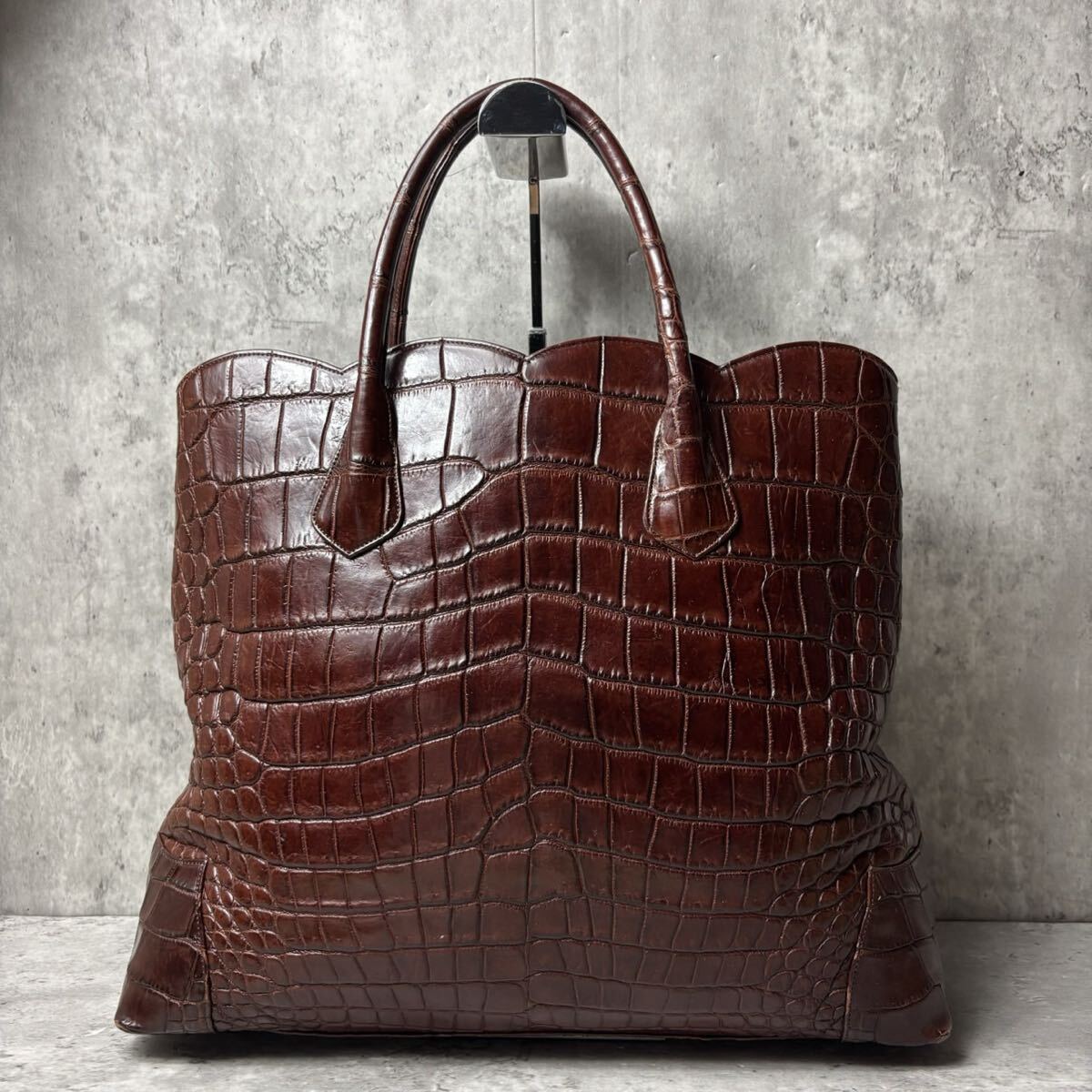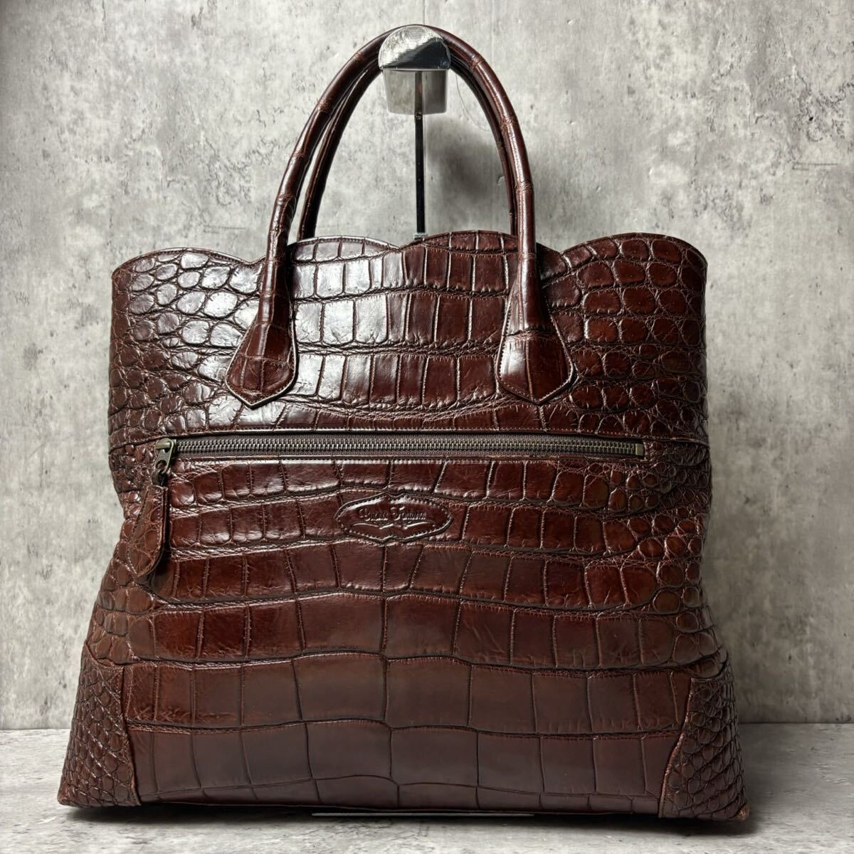 36cm×32cm×9.5cmの迫力ある特大個体を贅沢に使用した、Buona Fortuna のクロコダイルトートバッグです。センター取りの整った斑模様は一点物級の存在感があり、手にした瞬間から“自分だけの特別な逸品を手に入れた”という満足感が広がります。落ち着いたマットクロコの質感はビジネスにも普段使いにも自然に馴染み、市場でもこのサイズ・状態の個体は極めて希少。肩掛け可能で実用性も高く、長く愛せる一品です。