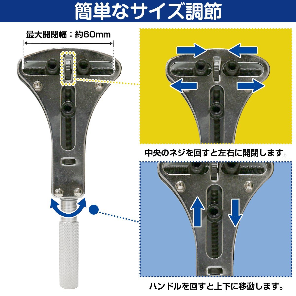 最大開閉幅は約60mmなので大型腕時計にも使用できます。