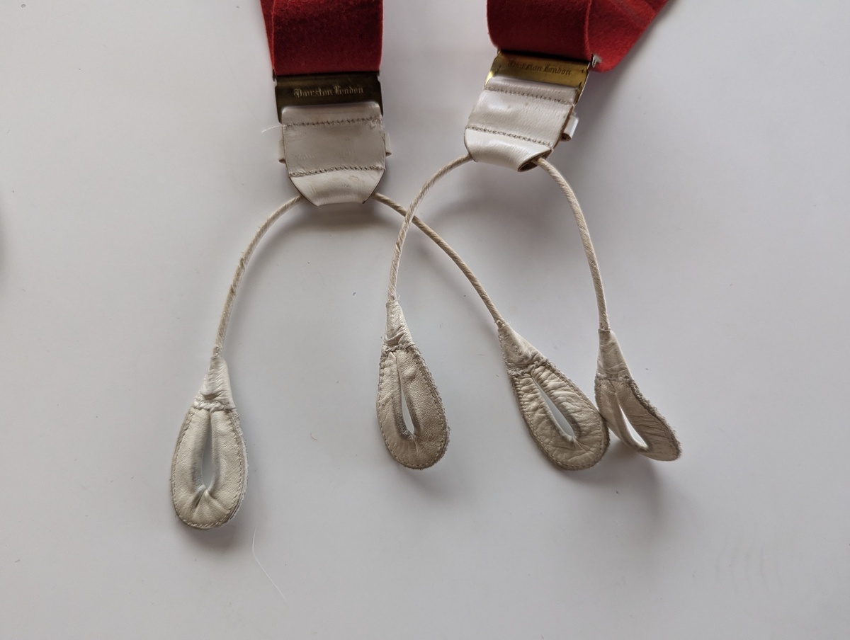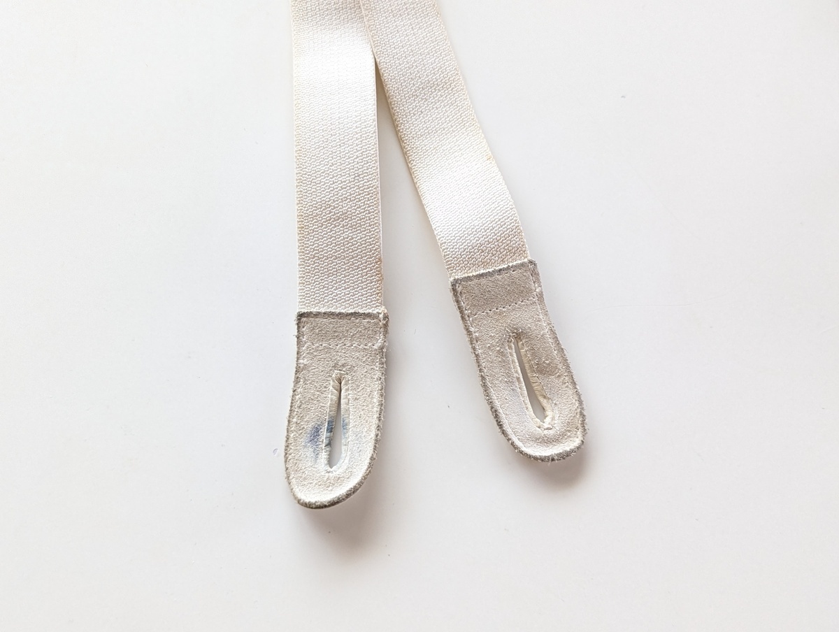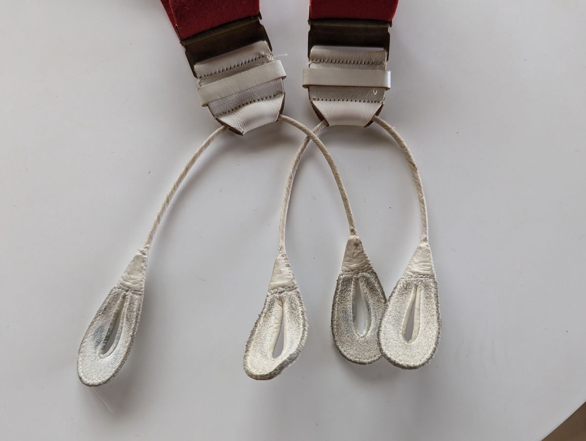 ストリング部分が今では用いられない高級素材ガットです。サヴィルローテーラーによるとストリングが細いほど粋で、ガットのサスペンダーは粋の極みとのことです。ガットは羊か牛の腸の革です。クジラ髭などというデマが広まっているのでお気をつけください。信濃屋の白井さんはきちんと動物の腸と言及しておられ、そもそもガットは英語で腸を意味します。