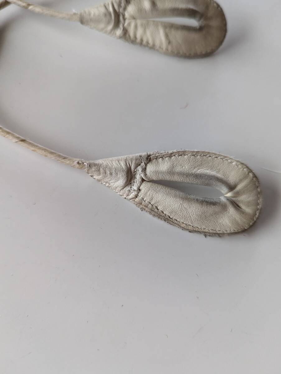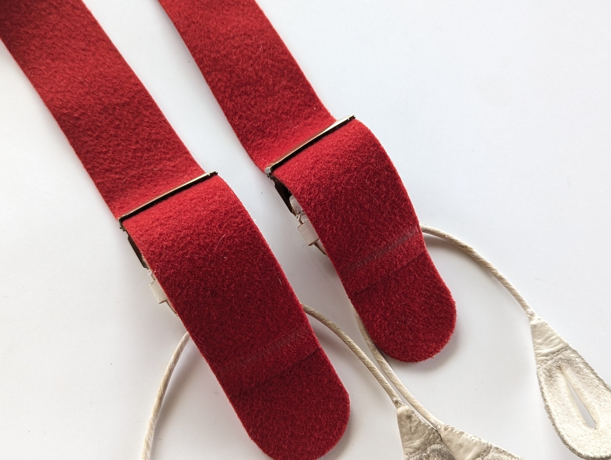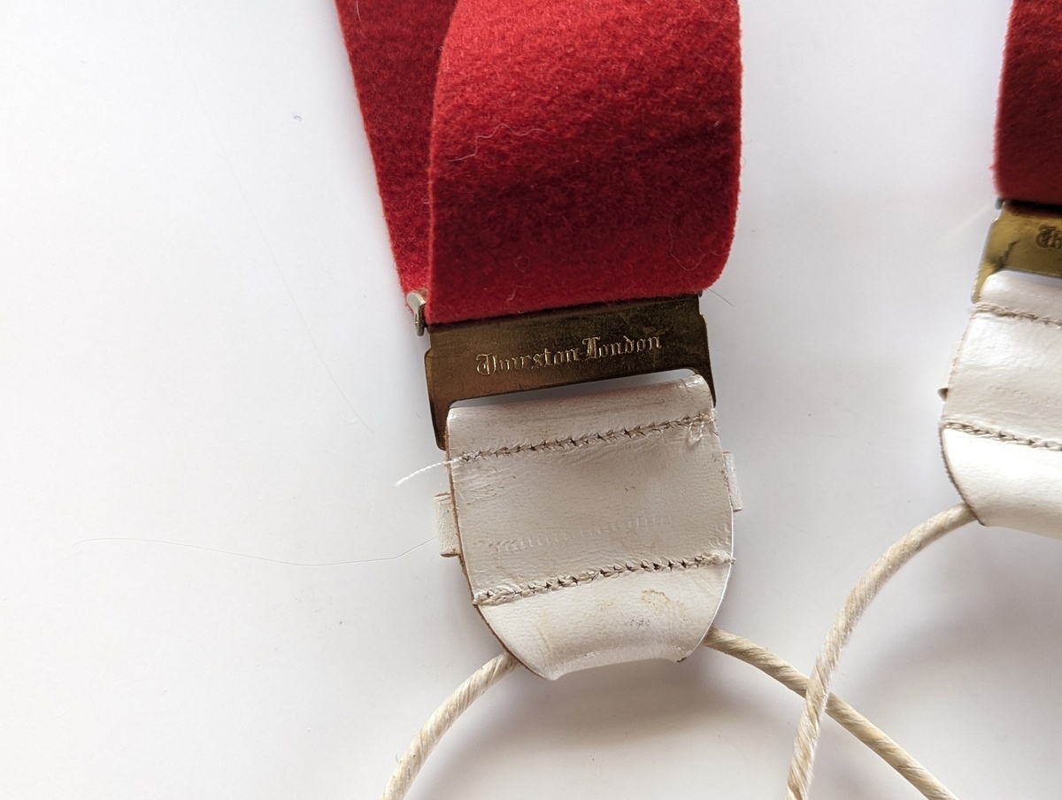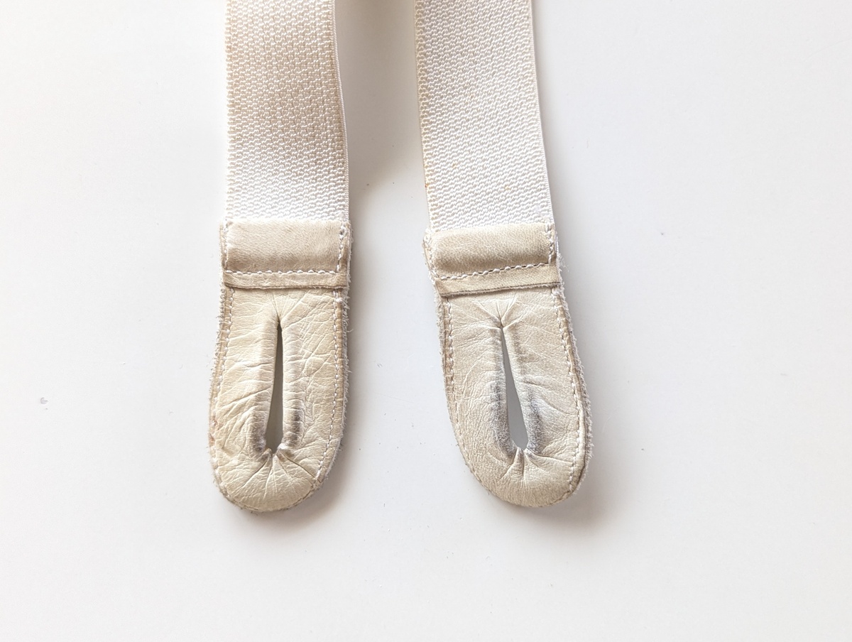 ストリング部分が今では用いられない高級素材ガットです。サヴィルローテーラーによるとストリングが細いほど粋で、ガットのサスペンダーは粋の極みとのことです。ガットは羊か牛の腸の革です。クジラ髭などというデマが広まっているのでお気をつけください。信濃屋の白井さんはきちんと動物の腸と言及しておられ、そもそもガットは英語で腸を意味します。