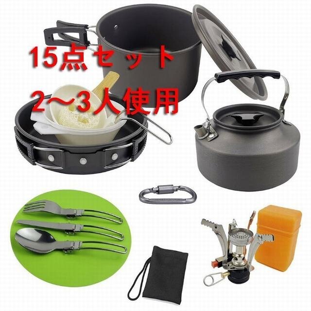 材質:アルミ 重量: 約1080g 使用人数:2~3人 15点セット内容: 鍋1,フライパン1,やかん1,木製シャベル1,スプーン1,テーブルナイフ1,フォーク1,バーナー1,食品レベルPPお碗3,PPカッティングボード1,スポンジ1,Dリング1, 付属品:小さな布バッグ*1,収納袋*1