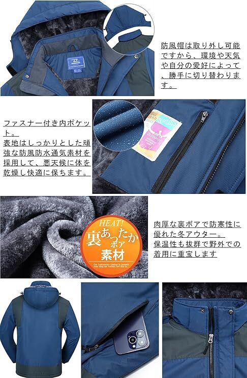 アウター メンズ マウンテンジャケット フード付 取り外し可能 スキーウェア 防寒コート 多機能 保温 裏ボア 暖かい 防風 防寒着 撥水加工 保温 バイク 冬 登山ジャケット