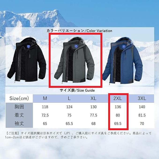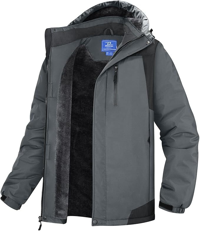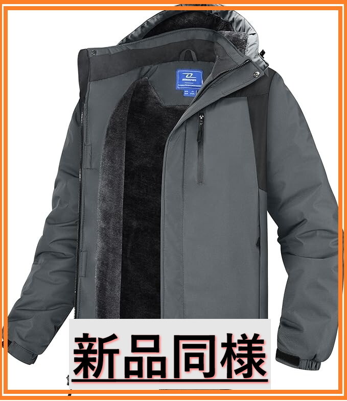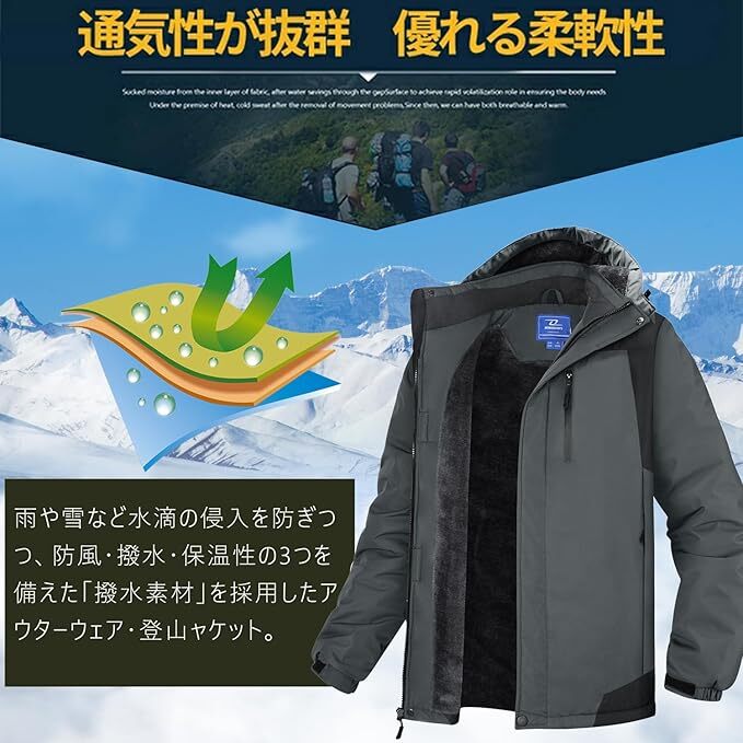 1343 2XL アウター メンズ マウンテンジャケット ダークグレー フード付 スキーウェア 防寒コート 保温 裏ボア 撥水加工 登山ジャケット