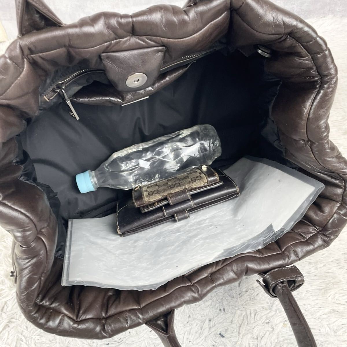 写真にあるバッグ内の小物(財布、ペットボトルなど)はサイズ感を確認するための小道具です。
